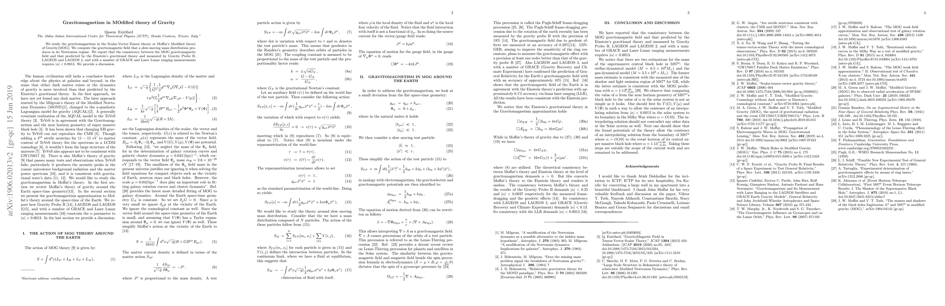 This paper investigates gravitomagnetism within Moffat's Modified theory of Gravity (MOG), finding that the MOG gravitomagnetic field aligns closely with Einstein's predictions and measurements from Gravity Probe B, LAGEOS, and GRACE, requiring $|\alpha| < 0.0013$ for consistency. The study concludes with a discussion on the implications of these findings.