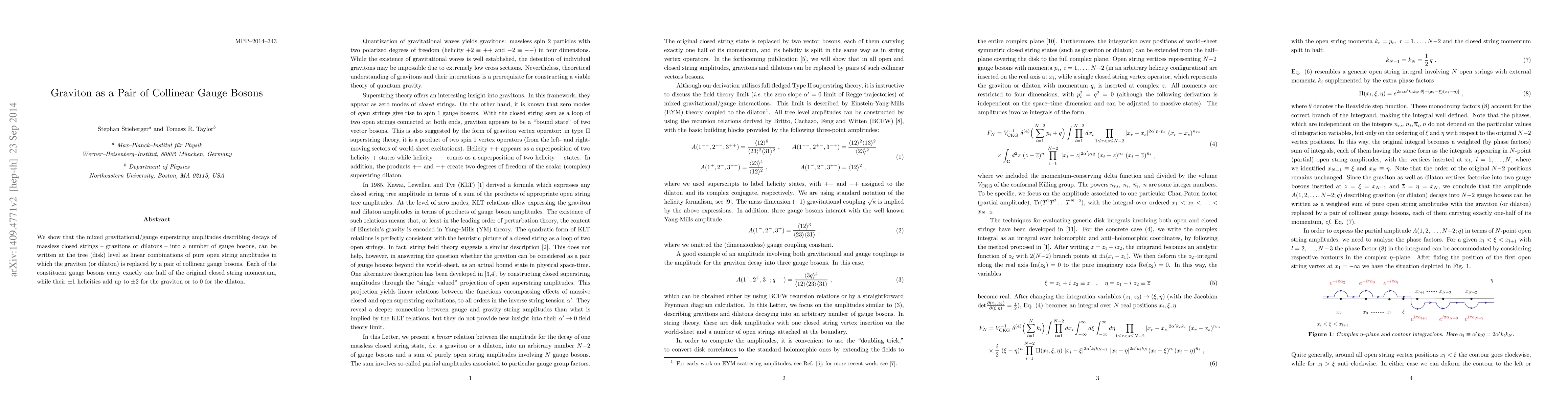 We show that the mixed gravitational/gauge superstring amplitudes describing decays of massless closed strings - gravitons or dilatons - into a number of gauge bosons, can be written at the tree (disk) level as linear combinations of pure open string amplitudes in which the graviton (or dilaton) is replaced by a pair of collinear gauge bosons. Each of the constituent gauge bosons carry exactly one half of the original closed string momentum, while their +/- 1 helicities add up to +/- 2 for the graviton or to 0 for the dilaton.
