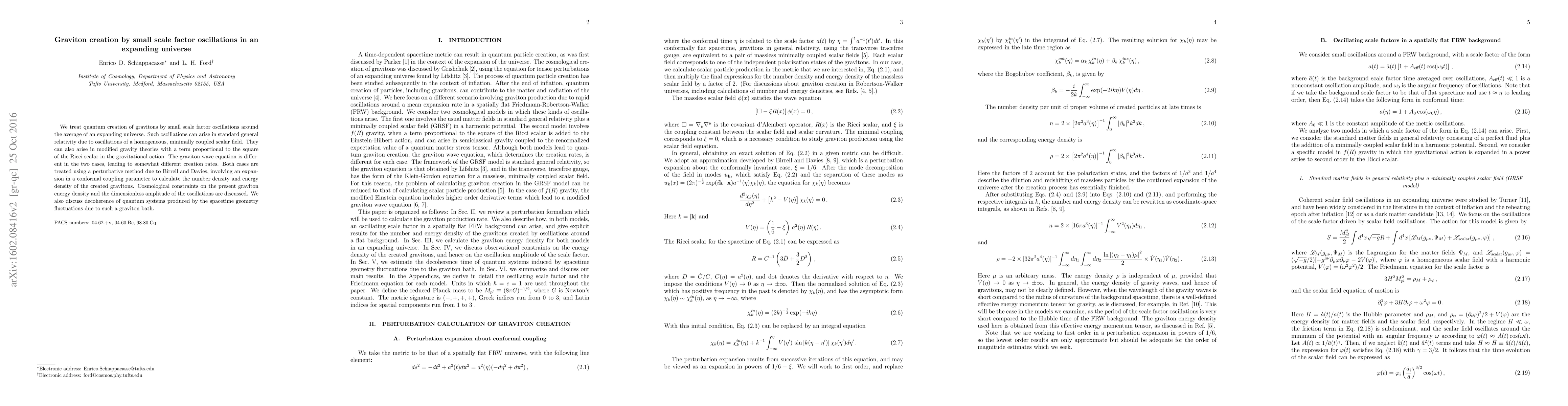 We treat quantum creation of gravitons by small scale factor oscillations around the average of an expanding universe. Such oscillations can arise in standard general relativity due to oscillations of a homogeneous, minimally coupled scalar field. They can also arise in modified gravity theories with a term proportional to the square of the Ricci scalar in the gravitational action. The graviton wave equation is different in the two cases, leading to somewhat different creation rates. Both cases are treated using a perturbative method due to Birrell and Davies, involving an expansion in a conformal coupling parameter to calculate the number density and energy density of the created gravitons. Cosmological constraints on the present graviton energy density and the dimensionless amplitude of the oscillations are discussed. We also discuss decoherence of quantum systems produced by the spacetime geometry fluctuations due to such a graviton bath.