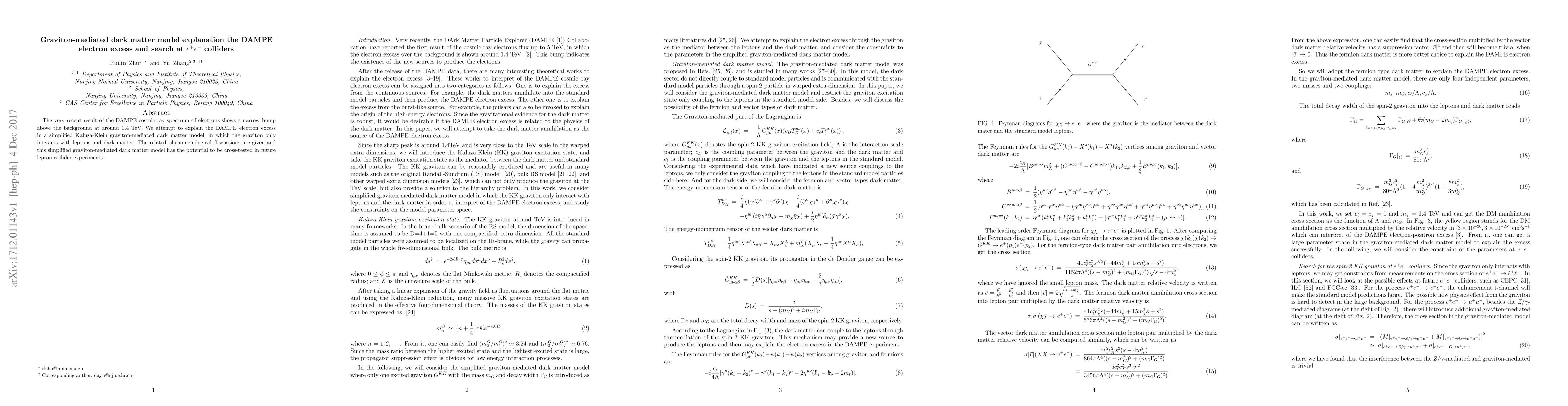 The very recent result of the DAMPE cosmic ray spectrum of electrons shows a narrow bump above the background at around 1.4 TeV. We attempt to explain the DAMPE electron excess in a simplified Kaluza-Klein graviton-mediated dark matter model, in which the graviton only interacts with leptons and dark matter. The related phenomenological discussions are given and this simplified graviton-mediated dark matter model has the potential to be cross-tested in future lepton collider experiments.