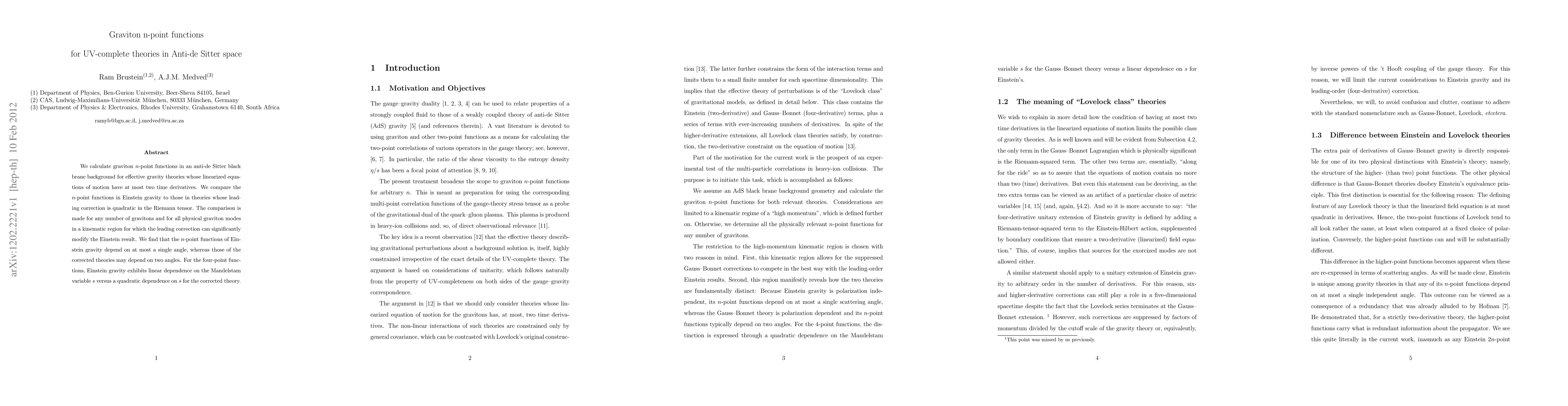 Researchers calculated graviton n-point functions in anti-de Sitter space for theories with limited time derivatives, comparing them to Einstein gravity. They found that the corrected theories can depend on more angles than Einstein gravity, leading to different dependence on Mandelstam variable s.