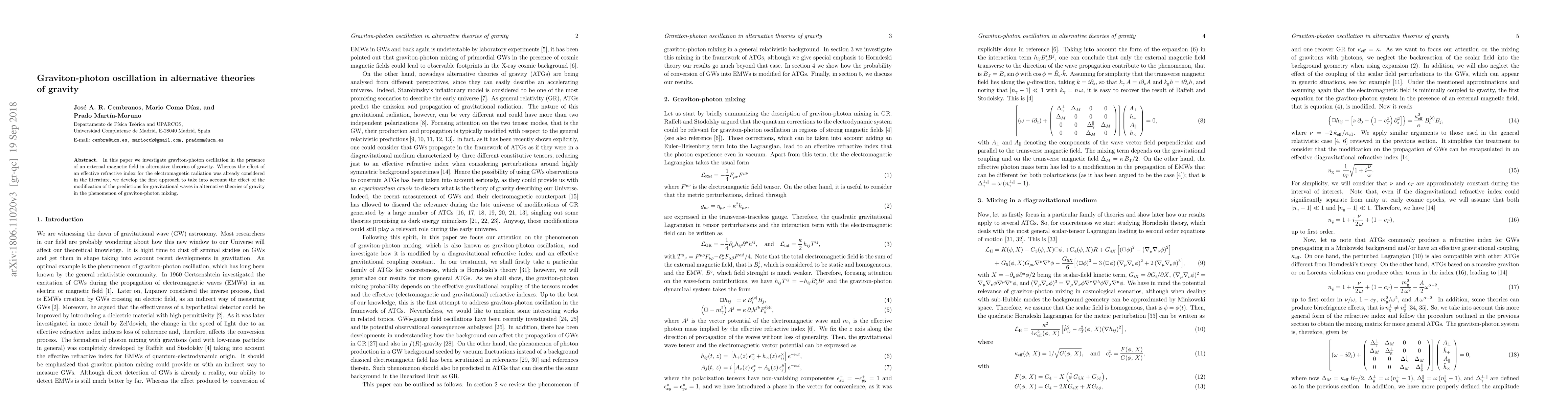 This paper explores graviton-photon oscillation under an external magnetic field in alternative gravity theories, focusing on how these theories modify gravitational wave predictions and their interaction with electromagnetic radiation. It introduces a novel approach to understand the phenomenon of graviton-photon mixing.