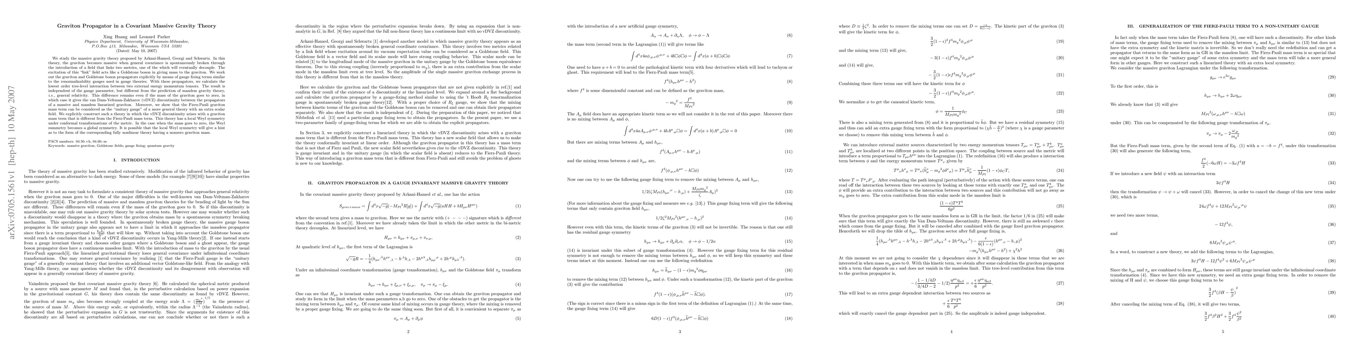We study the massive gravity theory proposed by Arkani-Hamed, Georgi and Schwartz. In this theory, the graviton becomes massive when general covariance is spontaneously broken through the introduction of a field that links two metrics, one of the which will eventually decouple. The excitation of this "link" field acts like a Goldstone boson in giving mass to the graviton. We work out the graviton and Goldstone boson propagators explicitly by means of gauge fixing terms similar to the renormalizability gauges used in gauge theories. With these propagators, we calculate the lowest order tree-level interaction between two external energy momentum tensors. The result is independent of the gauge parameter, but different from the prediction of massless gravity theory, i.e., general relativity. This difference remains even if the mass of the graviton goes to zero, in which case it gives the van Dam-Veltman-Zakharov (vDVZ) discontinuity between the propagators of a massive and massless linearized graviton. Moreover, we show that the Fierz-Pauli graviton mass term can be considered as the ``unitary gauge'' of a more general theory with an extra scalar field. We explicitly construct such a theory in which the vDVZ discontinuity arises with a graviton mass term that is different from the Fierz-Pauli mass term. This theory has a local Weyl symmetry under conformal transformations of the metric. In the case when the mass goes to zero, the Weyl summetry becomes a global symmetry. It is possible that the local Weyl symmetry will give a hint as to the form of the corresponding fully nonlinear theory having a nonzero graviton mass.