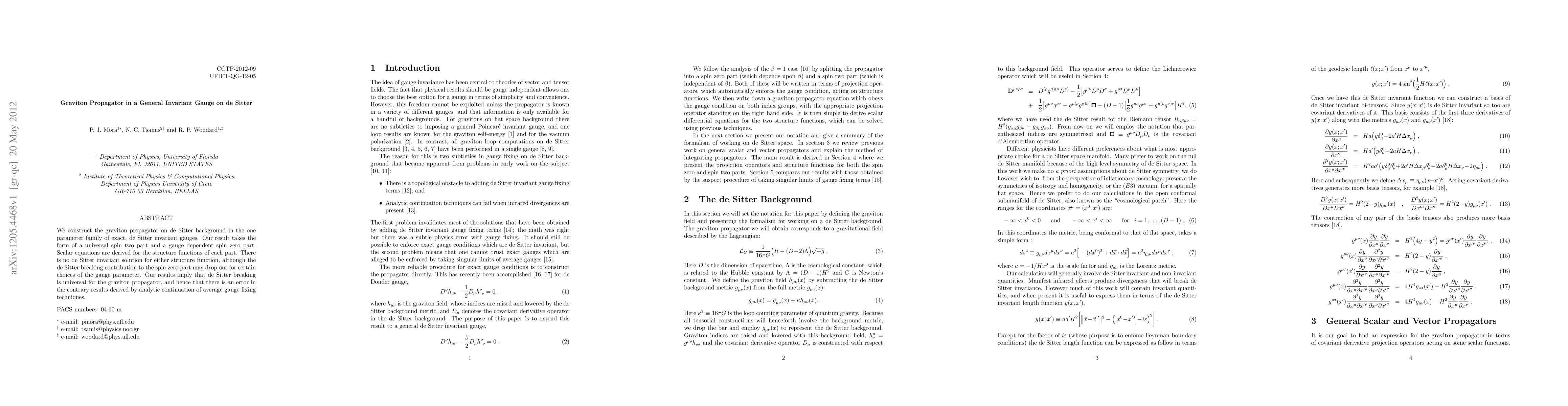 We construct the graviton propagator on de Sitter background in the one parameter family of exact, de Sitter invariant gauges. Our result takes the form of a universal spin two part and a gauge dependent spin zero part. Scalar equations are derived for the structure functions of each part. There is no de Sitter invariant solution for either structure function, although the de Sitter breaking contribution to the spin zero part may drop out for certain choices of the gauge parameter. Our results imply that de Sitter breaking is universal for the graviton propagator, and hence that there is an error in the contrary results derived by analytic continuation of average gauge fixing techniques.