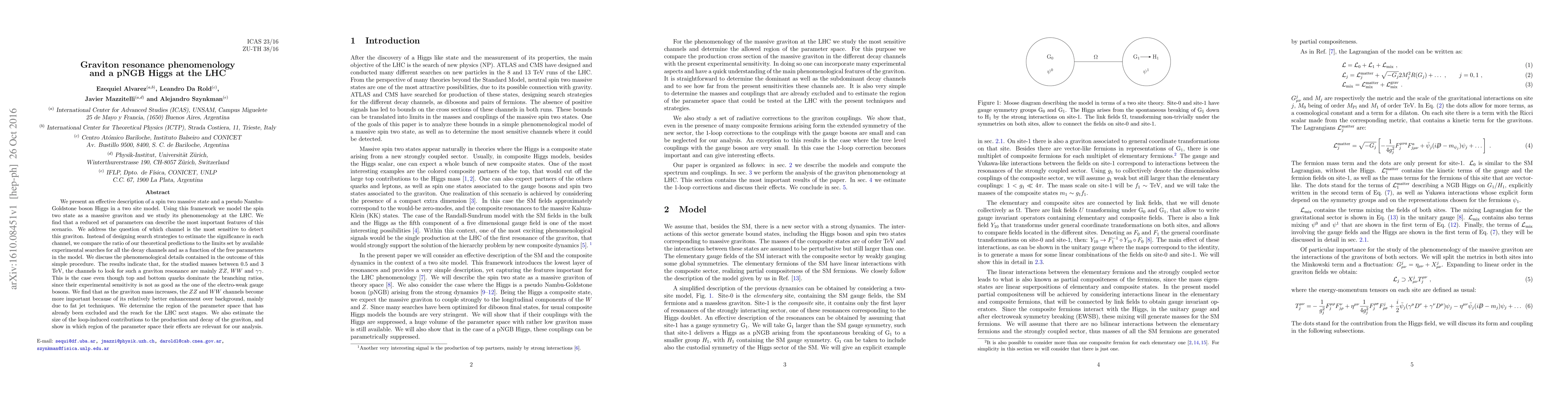 We present an effective description of a spin two massive state and a pseudo Nambu-Goldstone boson Higgs in a two site model. Using this framework we model the spin two state as a massive graviton and we study its phenomenology at the LHC. We find that a reduced set of parameters can describe the most important features of this scenario. We address the question of which channel is the most sensitive to detect this graviton. Instead of designing search strategies to estimate the significance in each channel, we compare the ratio of our theoretical predictions to the limits set by available experimental searches for all the decay channels and as a function of the free parameters in the model. We discuss the phenomenological details contained in the outcome of this simple procedure. The results indicate that, for the studied masses between 0.5 and 3 TeV, the channels to look for such a graviton resonance are mainly $ZZ$, $WW$ and $\gamma\gamma$. This is the case even though top and bottom quarks dominate the branching ratios, since their experimental sensitivity is not as good as the one of the electro-weak gauge bosons. We find that as the graviton mass increases, the $ZZ$ and $WW$ channels become more important because of its relatively better enhancement over background, mainly due to fat jet techniques. We determine the region of the parameter space that has already been excluded and the reach for the LHC next stages. We also estimate the size of the loop-induced contributions to the production and decay of the graviton, and show in which region of the parameter space their effects are relevant for our analysis.