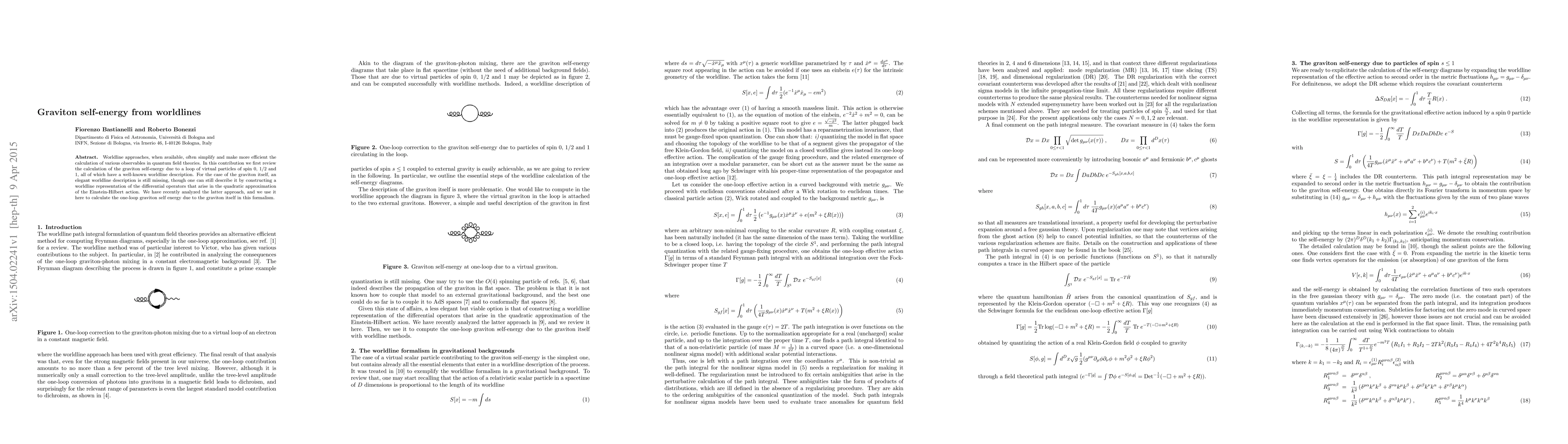 Worldline approaches, when available, often simplify and make more efficient the calculation of various observables in quantum field theories. In this contribution we first review the calculation of the graviton self-energy due to a loop of virtual particles of spin 0, 1/2 and 1, all of which have a well-known worldline description. For the case of the graviton itself, an elegant worldline description is still missing, though one can still describe it by constructing a worldline representation of the differential operators that arise in the quadratic approximation of the Einstein-Hilbert action. We have recently analyzed the latter approach, and we use it here to calculate the one-loop graviton self energy due to the graviton itself in this formalism.