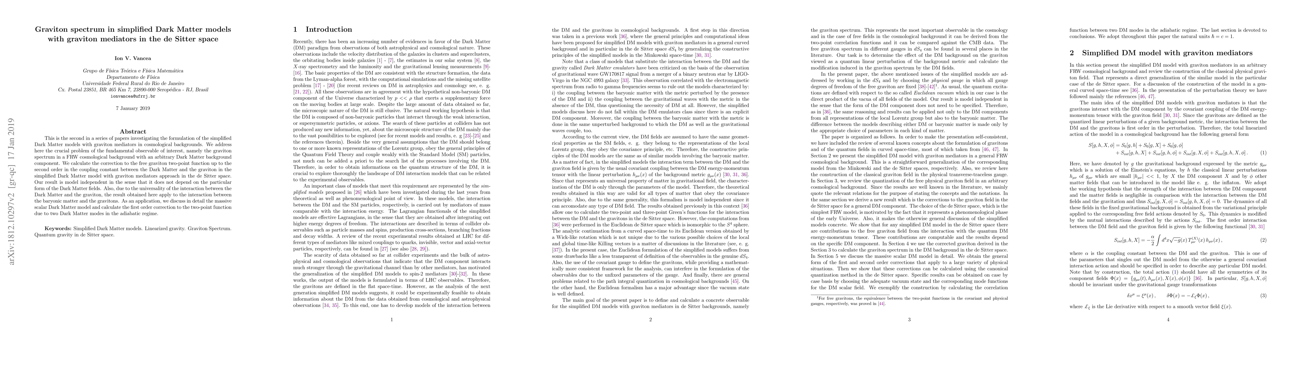 This is the second in a series of papers investigating the formulation of the simplified Dark Matter models with graviton mediators in cosmological backgrounds. We address here the crucial problem of the fundamental observable of interest, namely the graviton spectrum in a FRW cosmological background with an arbitrary Dark Matter background component. We calculate the correction to the free graviton two-point function up to the second order in the coupling constant between the Dark Matter and the graviton in the simplified Dark Matter model with graviton mediators approach in the de Sitter space. Our result is model independent in the sense that it does not depend on the particular form of the Dark Matter fields. Also, due to the universality of the interaction between the Dark Matter and the graviton, the result obtained here apply to the interaction between the baryonic matter and the gravitons. As an application, we discuss in detail the massive scalar Dark Matter model and calculate the first order correction to the two-point function due to two Dark Matter modes in the adiabatic regime.