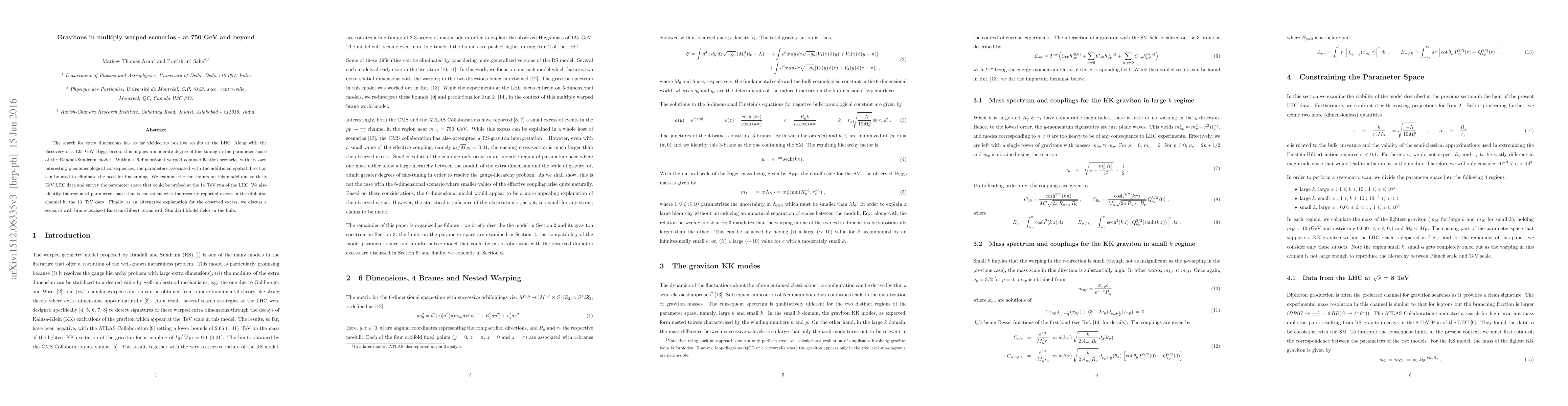 The search for extra dimensions has so far yielded no positive results at the LHC. Along with the discovery of a 125 GeV Higgs boson, this implies a moderate degree of fine tuning in the parameter space of the Randall-Sundrum model. Within a 6-dimensional warped compactification scenario, with its own interesting phenomenological consequences, the parameters associated with the additional spatial direction can be used to eliminate the need for fine tuning. We examine the constraints on this model due to the 8 TeV LHC data and survey the parameter space that could be probed at the 14 TeV run of the LHC. We also identify the region of parameter space that is consistent with the recently reported excess in the diphoton channel in the 13 TeV data. Finally, as an alternative explanation for the observed excess, we discuss a scenario with brane-localized Einstein-Hilbert terms with Standard Model fields in the bulk.