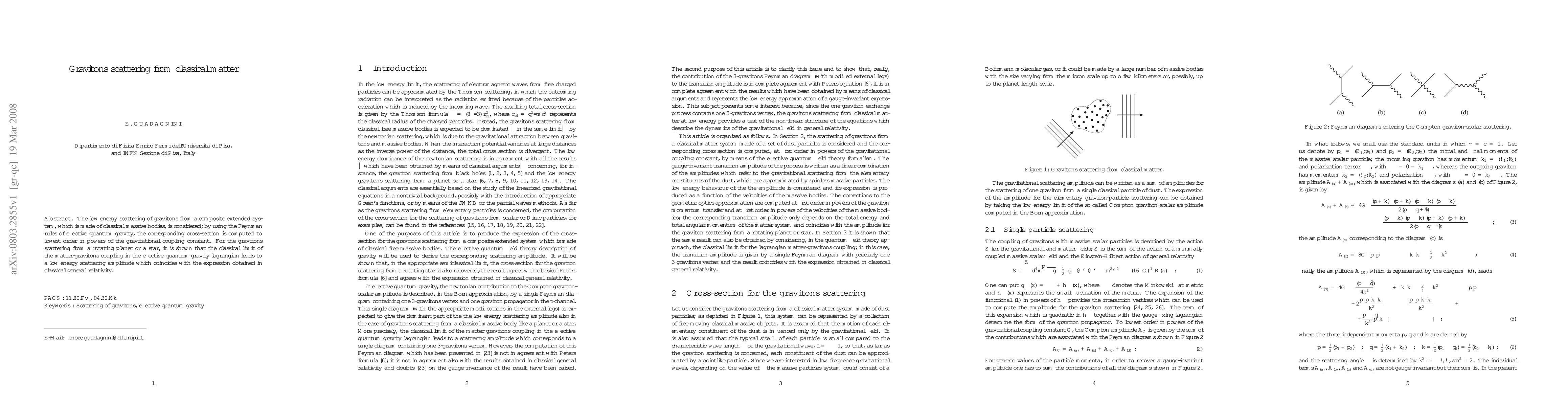 The low energy scattering of gravitons from a composite extended system, which is made of classical massive bodies, is considered; by using the Feynman rules of effective quantum gravity, the corresponding cross-section is computed to lowest order in powers of the gravitational coupling constant. For the gravitons scattering from a rotating planet or a star, it is shown that the classical limit of the matter-gravitons coupling in the effective quantum gravity lagrangian leads to a low energy scattering amplitude which coincides with the expression obtained in classical general relativity.