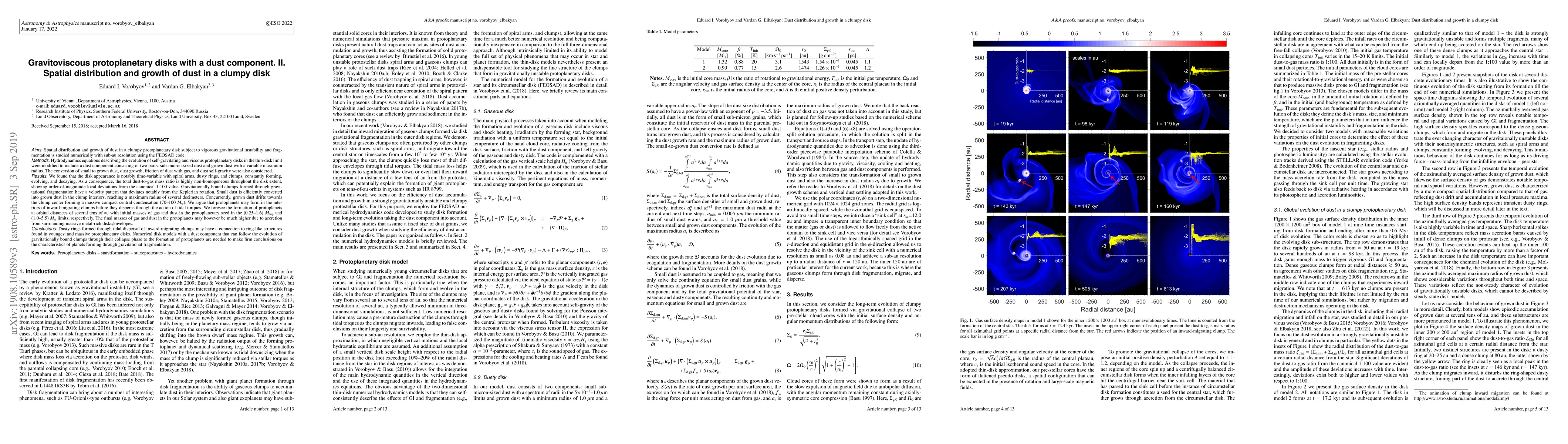 This paper numerically investigates the spatial distribution and growth of dust in a clumpy protoplanetary disk influenced by gravitational instability and fragmentation. The study reveals a highly variable disk with spiral arms, dusty rings, and clumps, leading to a non-homogeneous dust-to-gas mass ratio. Protoplanets may form within migrating clumps, potentially at orbital distances of several tens of au, with initial masses in the Jupiter and Earth mass ranges.