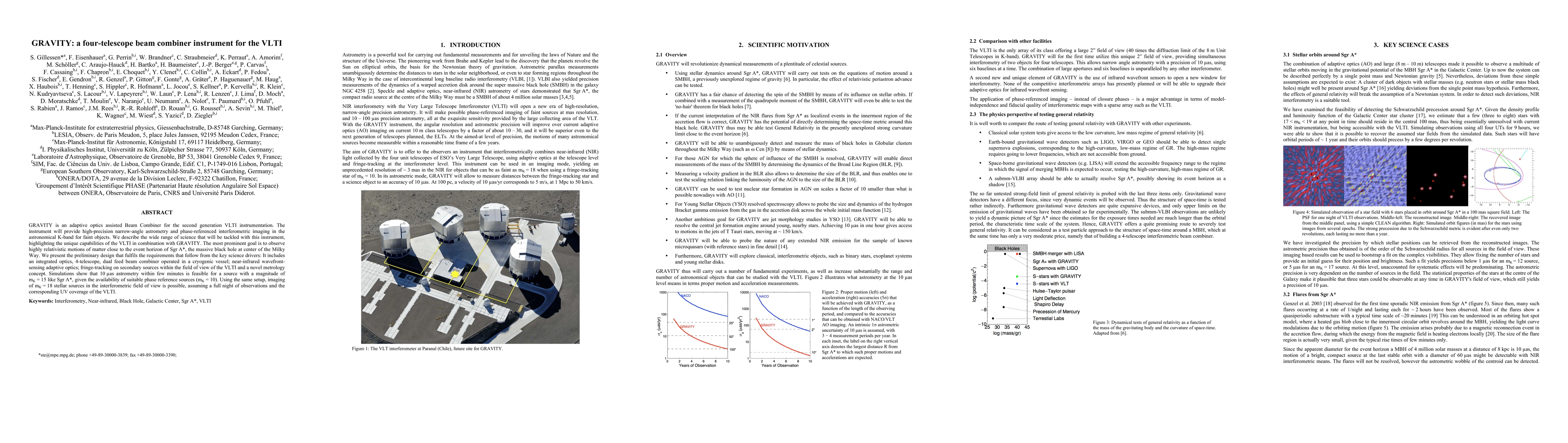 GRAVITY is an advanced adaptive optics beam combiner for the VLTI, designed to provide high-precision astrometry and interferometric imaging in the K-band. It aims to observe relativistic motions near the Milky Way's central black hole, Sgr A*, achieving 10 μas astrometry for sources like Sgr A* with suitable phase reference stars.