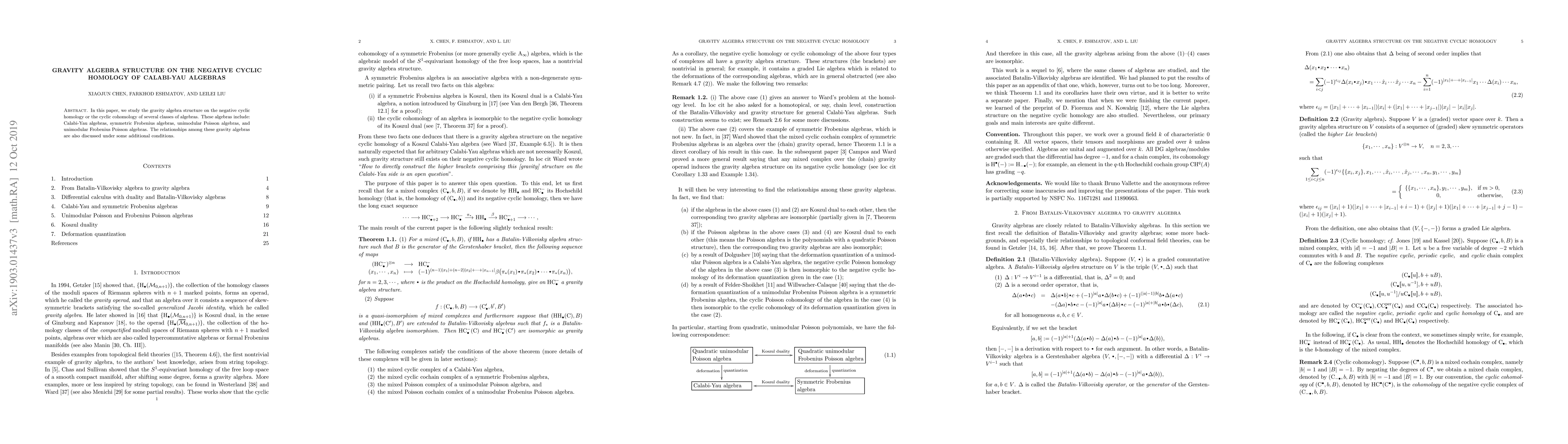 This paper investigates the gravity algebra structure on the negative cyclic homology of Calabi-Yau algebras and related classes, including symmetric Frobenius algebras, unimodular Poisson algebras, and unimodular Frobenius Poisson algebras. It also explores the relationships among these gravity algebras under certain conditions.