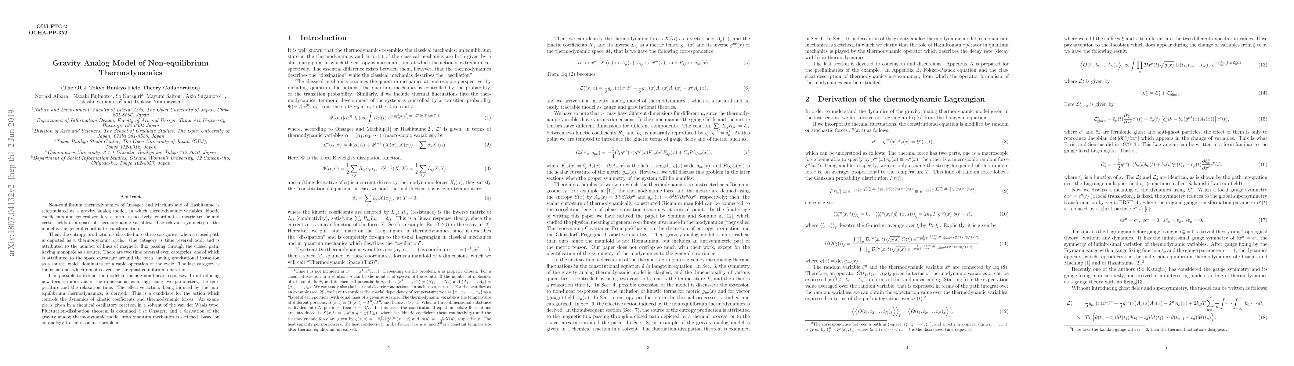 This paper reformulates non-equilibrium thermodynamics into a gravity analog model, mapping thermodynamic variables to coordinates, kinetic coefficients to metric tensors, and forces to vector fields. It classifies entropy production into three categories, linking them to magnetic flux lines, space curvature, and quasi-equilibrium operations, and extends the model to include non-linear responses.