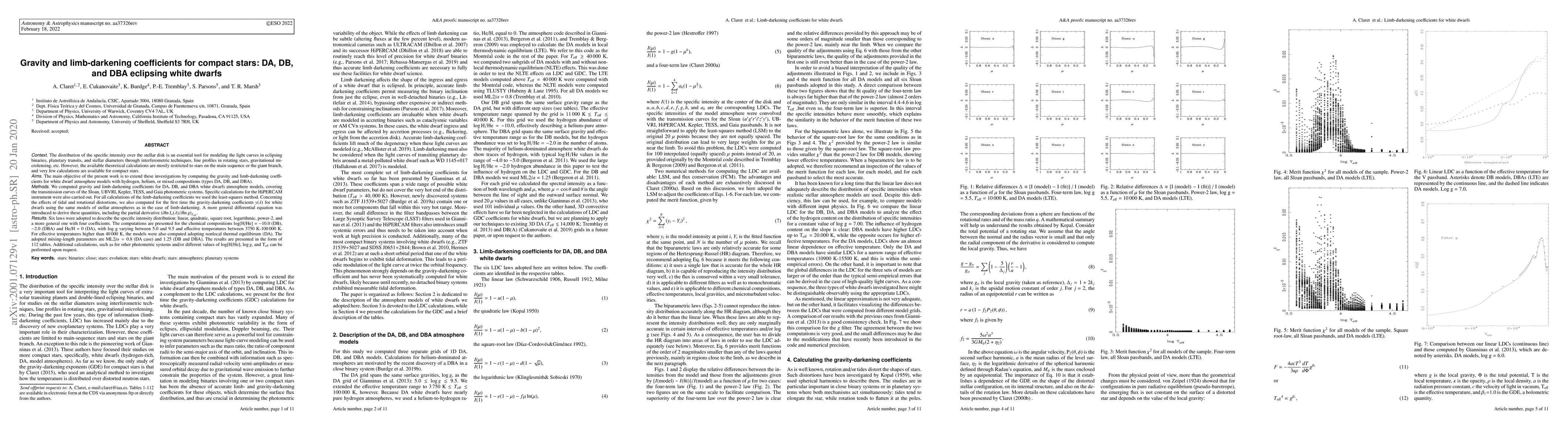 The study computed gravity and limb-darkening coefficients for white dwarf atmosphere models with hydrogen, helium, or mixed compositions (DA, DB, and DBA types) using the least-squares method. It also introduced a more general differential equation to derive gravity-darkening coefficients, including the partial derivative (∂lnI_o(λ)/∂ln g)_{T_eff}. Six laws were adopted to describe the specific intensity distribution.