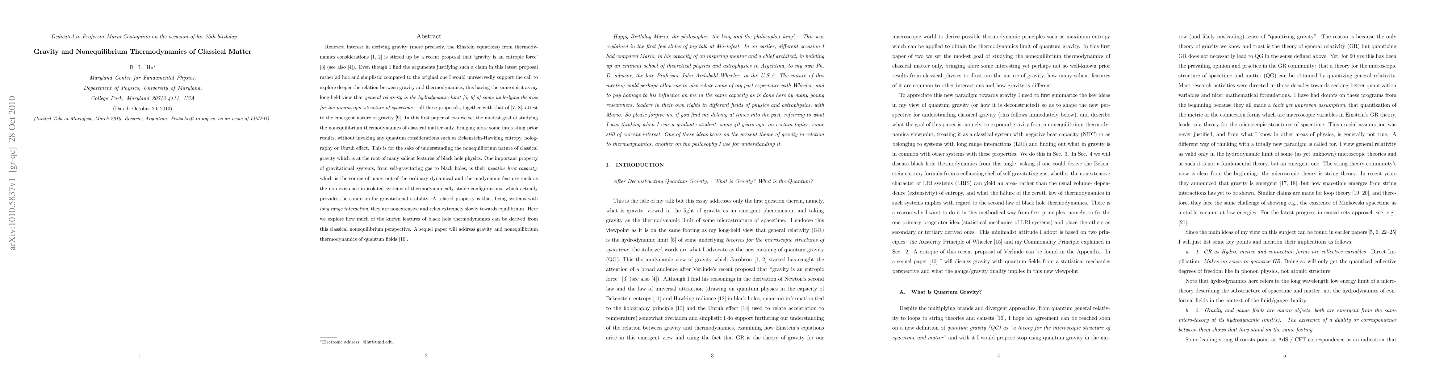 This paper explores the nonequilibrium thermodynamics of classical matter to understand the emergent nature of gravity, focusing on the negative heat capacity and nonextensive properties of gravitational systems. It aims to derive known features of black hole thermodynamics from a classical perspective without quantum considerations.