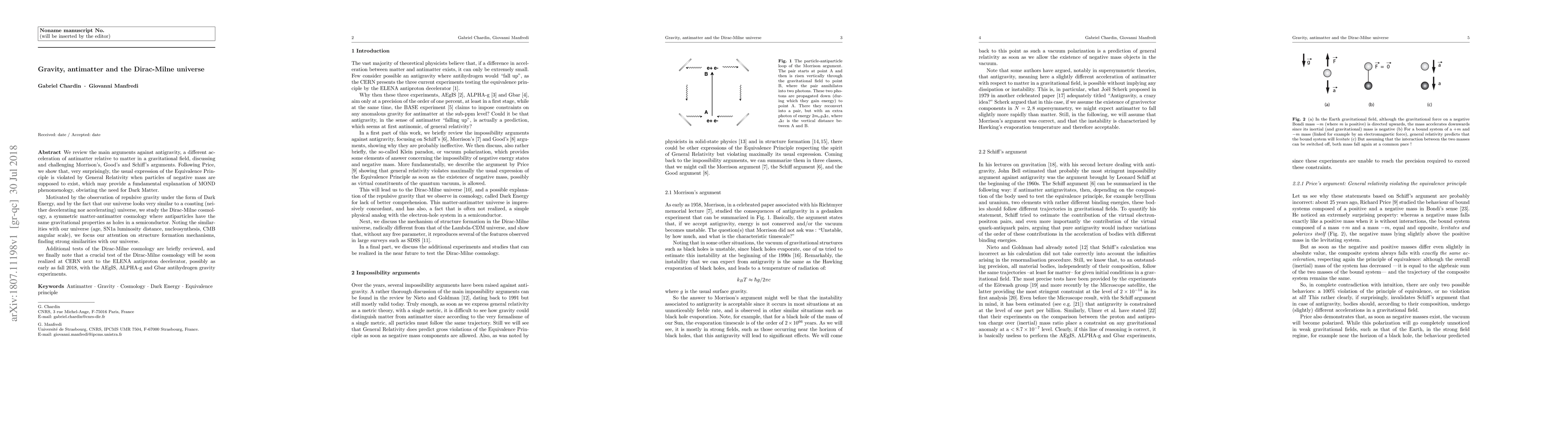 We review the main arguments against antigravity, a different acceleration of antimatter relative to matter in a gravitational field, discussing and challenging Morrison's, Good's and Schiff's arguments. Following Price, we show that, very surprisingly, the usual expression of the Equivalence Principle is violated by General Relativity when particles of negative mass are supposed to exist, which may provide a fundamental explanation of MOND phenomenology, obviating the need for Dark Matter. Motivated by the observation of repulsive gravity under the form of Dark Energy, and by the fact that our universe looks very similar to a coasting (neither decelerating nor accelerating) universe, we study the Dirac-Milne cosmology, a symmetric matter-antimatter cosmology where antiparticles have the same gravitational properties as holes in a semiconductor. Noting the similarities with our universe (age, SN1a luminosity distance, nucleosynthesis, CMB angular scale), we focus our attention on structure formation mechanisms, finding strong similarities with our universe. Additional tests of the Dirac-Milne cosmology are briefly reviewed, and we finally note that a crucial test of the Dirac-Milne cosmology will be soon realized at CERN next to the ELENA antiproton decelerator, possibly as early as fall 2018, with the AEgIS, ALPHA-g and Gbar antihydrogen gravity experiments.