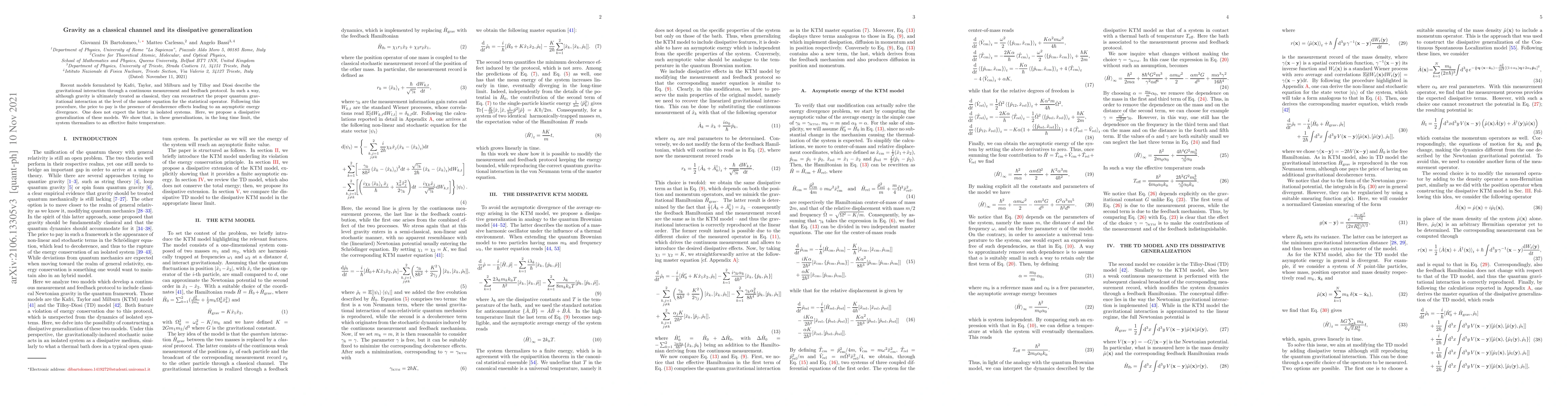 Recent models formulated by Kafri, Taylor, and Milburn and by Tilloy and Diosi describe the gravitational interaction through a continuous measurement and feedback protocol. In such a way, although gravity is ultimately treated as classical, they can reconstruct the proper quantum gravitational interaction at the level of the master equation for the statistical operator. Following this procedure, the price to pay is the presence of decoherence effects leading to an asymptotic energy divergence. One does not expect the latter in isolated systems. Here, we propose a dissipative generalization of these models. We show that, in these generalizations, in the long time limit, the system thermalizes to an effective finite temperature.