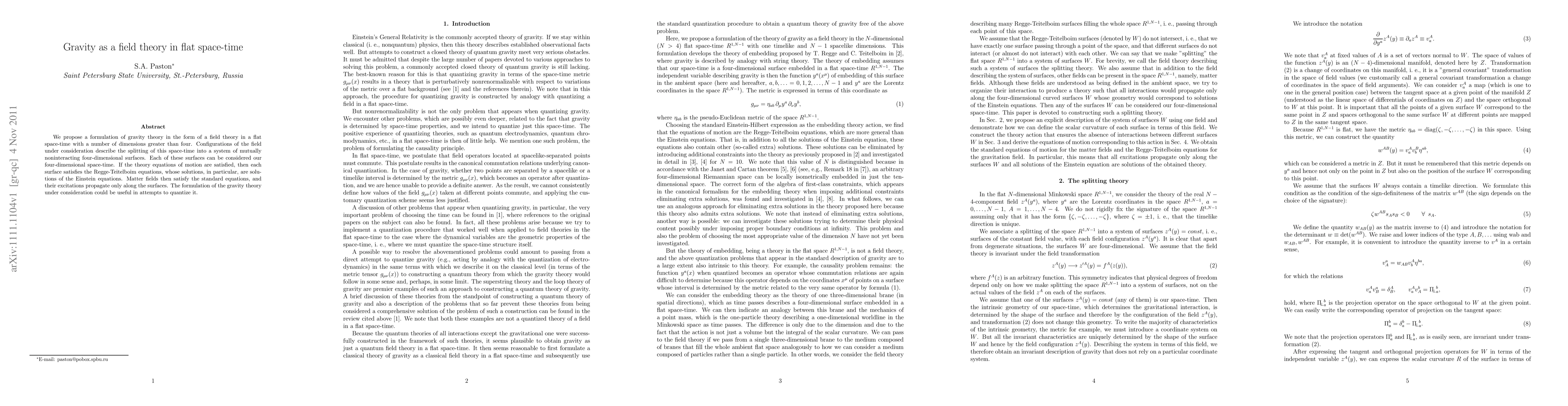 Researchers propose a new way to describe gravity as a field theory in flat space-time with more than four dimensions. This formulation shows that the laws of gravity can be broken down into smaller, mutually non-interacting surfaces, useful for attempts to quantize the theory.