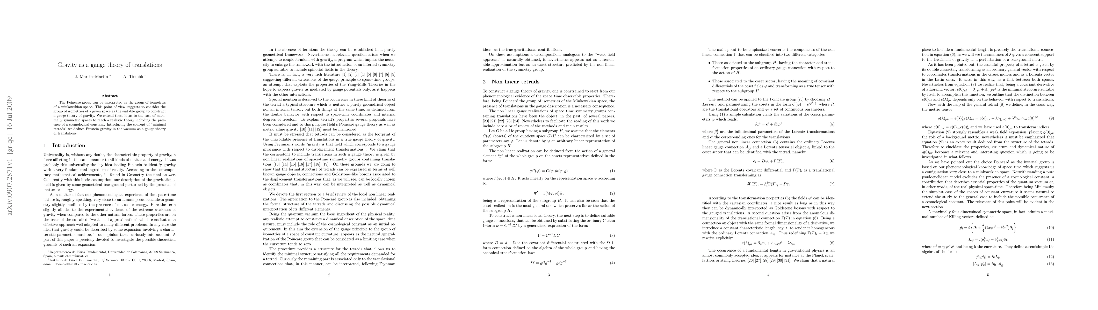 The Poincar\'e group can be interpreted as the group of isometries of a minkowskian space. This point of view suggests to consider the group of isometries of a given space as the suitable group to construct a gauge theory of gravity. We extend these ideas to the case of maximally symmetric spaces to reach a realistic theory including the presence of a cosmological constant. Introducing the concept of "minimal tetrads" we deduce Einstein gravity in the vacuum as a gauge theory of translations.
