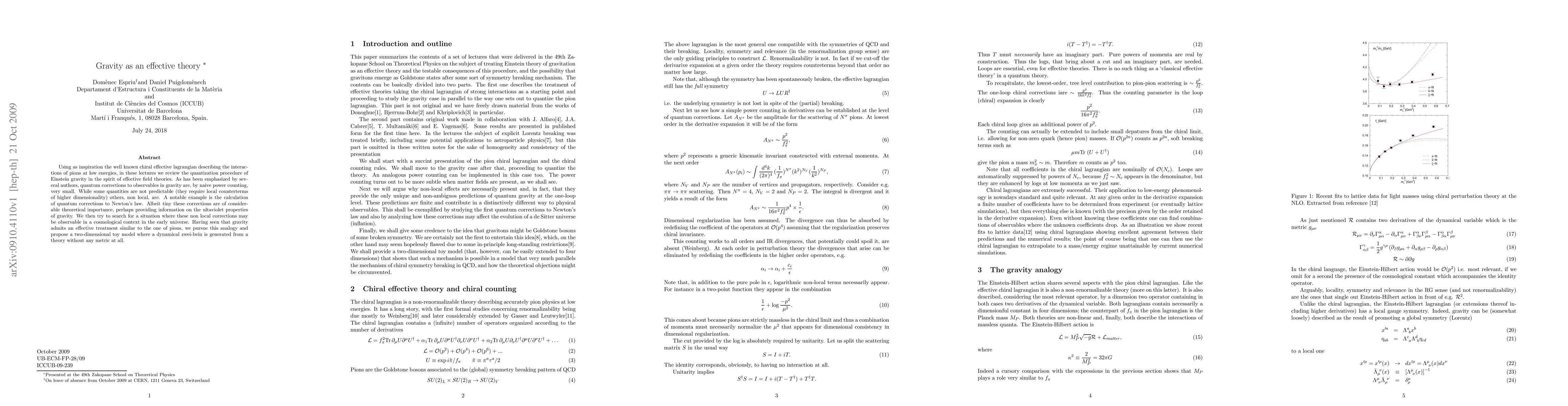 Using as inspiration the well known chiral effective lagrangian describing the interactions of pions at low energies, in these lectures we review the quantization procedure of Einstein gravity in the spirit of effective field theories. As has been emphasized by several authors, quantum corrections to observables in gravity are, by naive power counting, very small. While some quantities are not predictable (they require local counterterms of higher dimensionality) others, non local, are. A notable example is the calculation of quantum corrections to Newton's law. Albeit tiny these corrections are of considerable theoretical importance, perhaps providing information on the ultaviolet properties of gravity. We then try to search for a situation where these non local corrections may be observable in a cosmological context in the early universe. Having seen that gravity admits an effective treatment similar to the one of pions, we pursue this analogy and propose a two-dimensional toy model where a dynamical zwei-bein is generated from a theory without any metric at all.