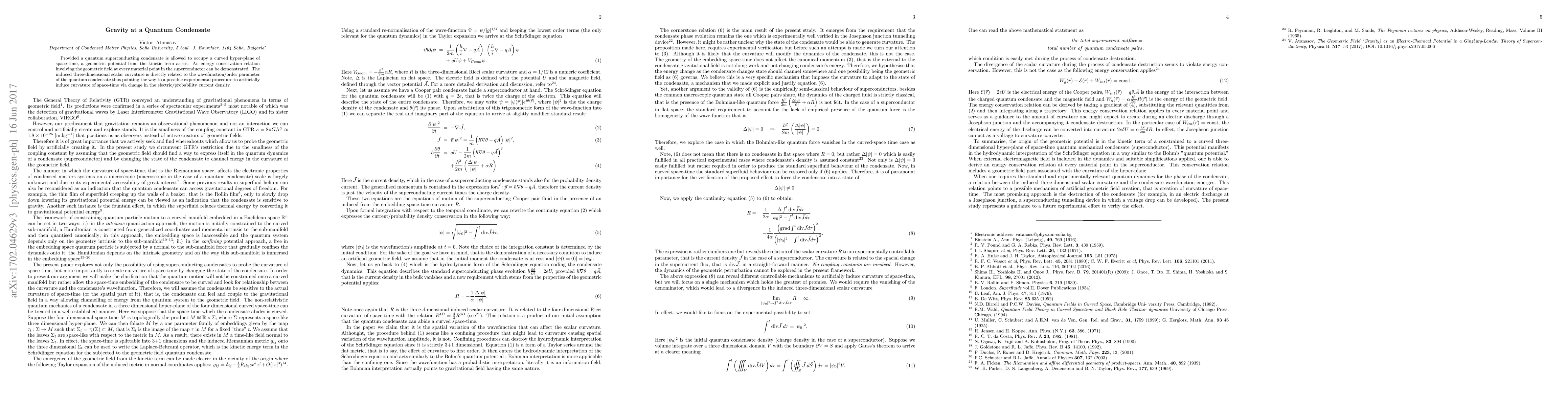 Provided a quantum superconducting condensate is allowed to occupy a curved hyper-plane of space-time, a geometric potential from the kinetic term arises. An energy conservation relation involving the geometric field at every material point in the superconductor can be demonstrated. The induced three-dimensional scalar curvature is directly related to the wavefunction/order parameter of the quantum condensate thus pointing the way to a possible experimental procedure to artificially induce curvature of space-time via change in the electric/probability current density.