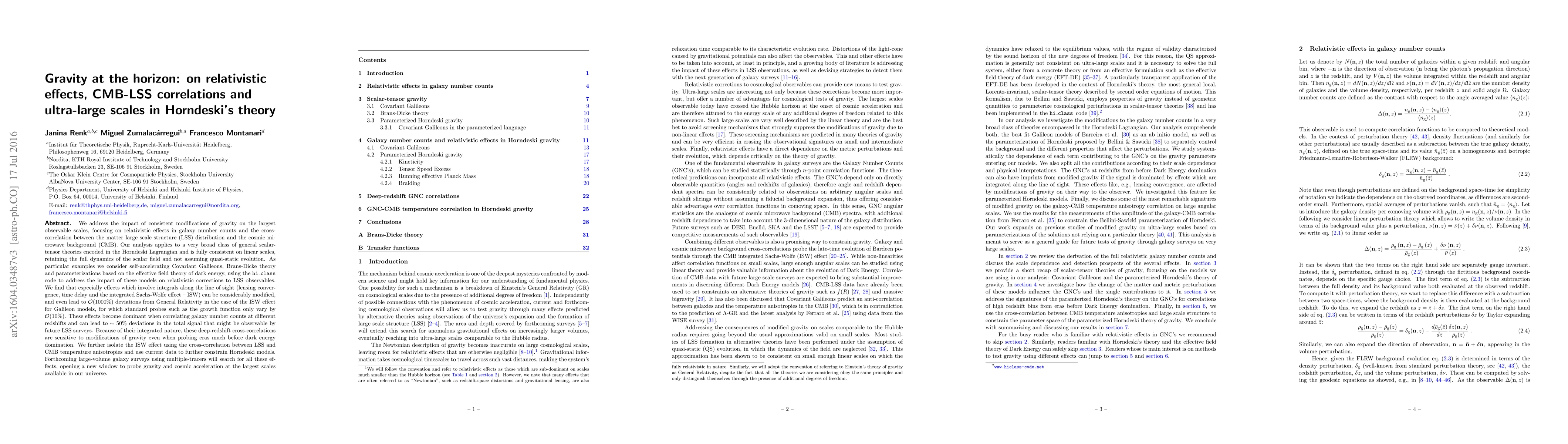 This paper investigates relativistic effects in Horndeski's theory on ultra-large scales, finding significant modifications to observables like lensing convergence and the integrated Sachs-Wolfe effect, which can deviate by up to 1000% from General Relativity in certain models. These effects are crucial for correlating galaxy number counts and can lead to observable deviations in future large-scale structure surveys.