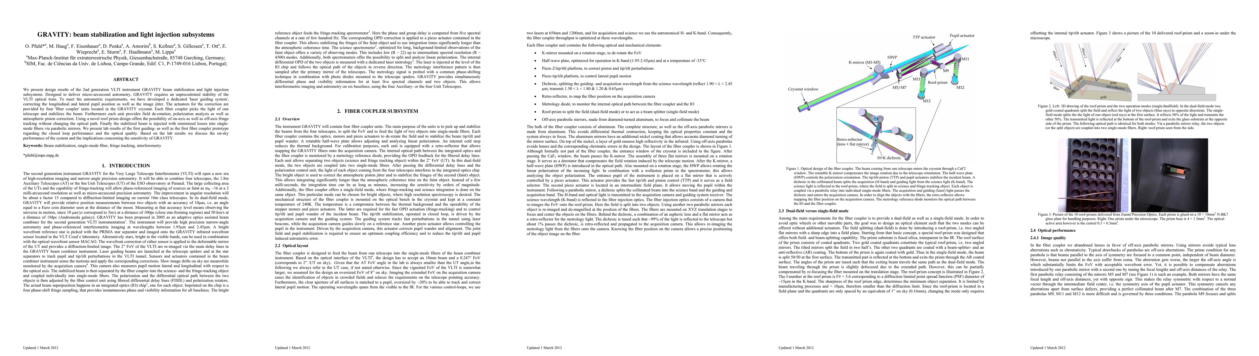 We present design results of the 2nd generation VLTI instrument GRAVITY beam stabilization and light injection subsystems. Designed to deliver micro-arcsecond astrometry, GRAVITY requires an unprecedented stability of the VLTI optical train. To meet the astrometric requirements, we have developed a dedicated 'laser guiding system', correcting the longitudinal and lateral pupil position as well as the image jitter. The actuators for the correction are provided by four 'fiber coupler' units located in the GRAVITY cryostat. Each fiber coupler picks the light of one telescope and stabilizes the beam. Furthermore each unit provides field de-rotation, polarization analysis as well as atmospheric piston correction. Using a novel roof prism design offers the possibility of on-axis as well as off-axis fringe tracking without changing the optical path. Finally the stabilized beam is injected with minimized losses into single-mode fibers via parabolic mirrors. We present lab results of the first guiding- as well as the first fiber coupler prototype regarding the closed loop performance and the optical quality. Based on the lab results we discuss the on-sky performance of the system and the implications concerning the sensitivity of GRAVITY.