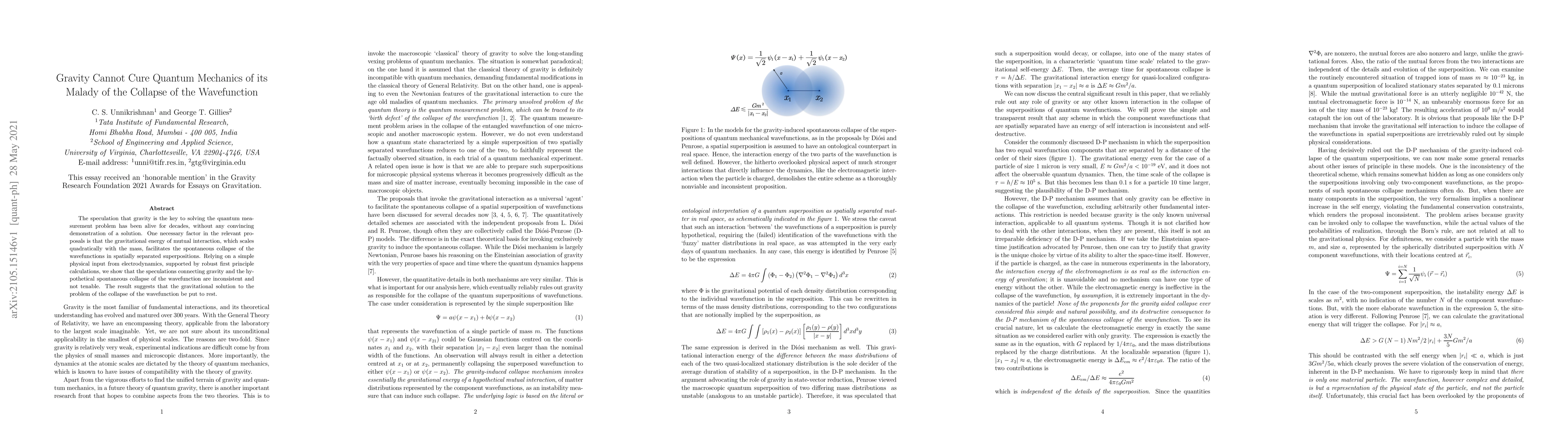 The paper argues that gravity cannot resolve the quantum measurement problem, specifically the collapse of the wavefunction, as gravitational energy does not facilitate the spontaneous collapse in the expected manner. The findings suggest that the hypothesis linking gravity to wavefunction collapse is inconsistent and should be abandoned.