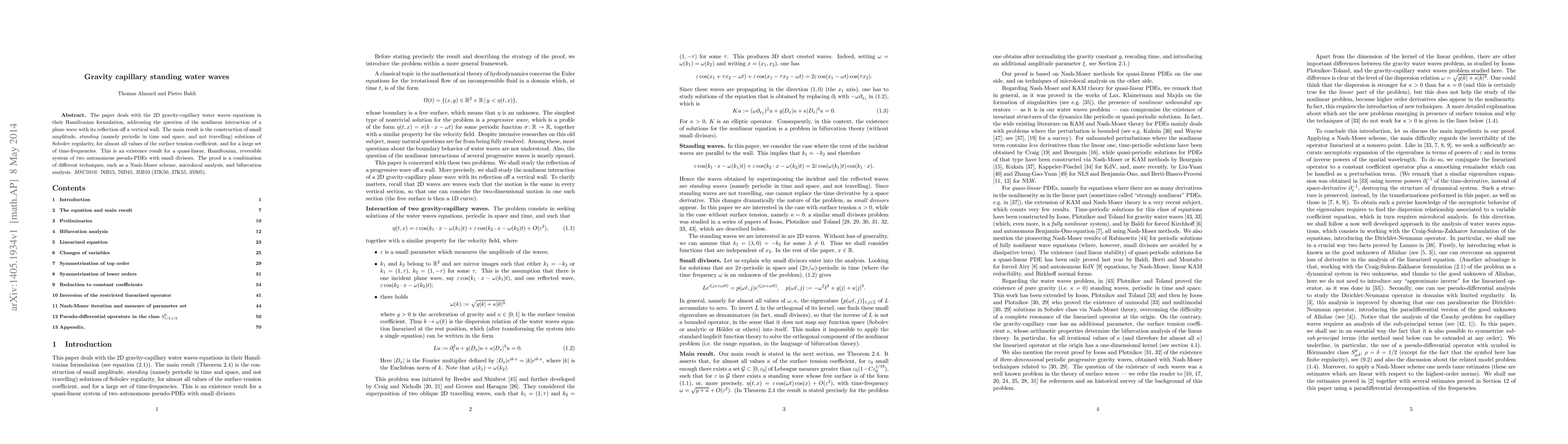 The paper deals with the 2D gravity-capillary water waves equations in their Hamiltonian formulation, addressing the question of the nonlinear interaction of a plane wave with its reflection off a vertical wall. The main result is the construction of small amplitude, standing (namely periodic in time and space, and not travelling) solutions of Sobolev regularity, for almost all values of the surface tension coefficient, and for a large set of time-frequencies. This is an existence result for a quasi-linear, Hamiltonian, reversible system of two autonomous pseudo-PDEs with small divisors. The proof is a combination of different techniques, such as a Nash-Moser scheme, microlocal analysis, and bifurcation analysis.