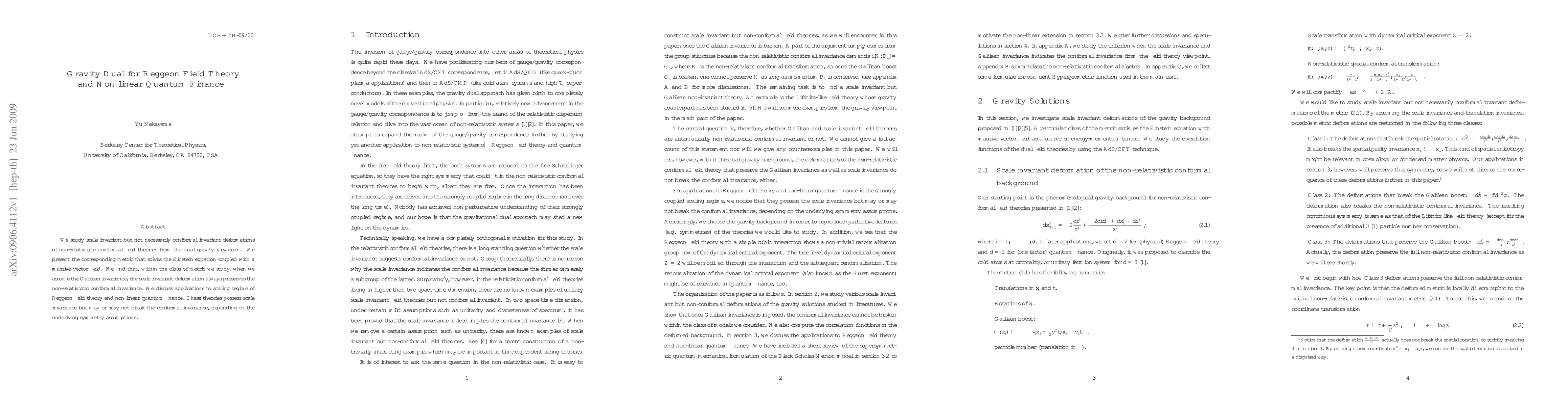 We study scale invariant but not necessarily conformal invariant deformations of non-relativistic conformal field theories from the dual gravity viewpoint. We present the corresponding metric that solves the Einstein equation coupled with a massive vector field. We find that, within the class of metric we study, when we assume the Galilean invariance, the scale invariant deformation always preserves the non-relativistic conformal invariance. We discuss applications to scaling regime of Reggeon field theory and non-linear quantum finance. These theories possess scale invariance but may or may not break the conformal invariance, depending on the underlying symmetry assumptions.