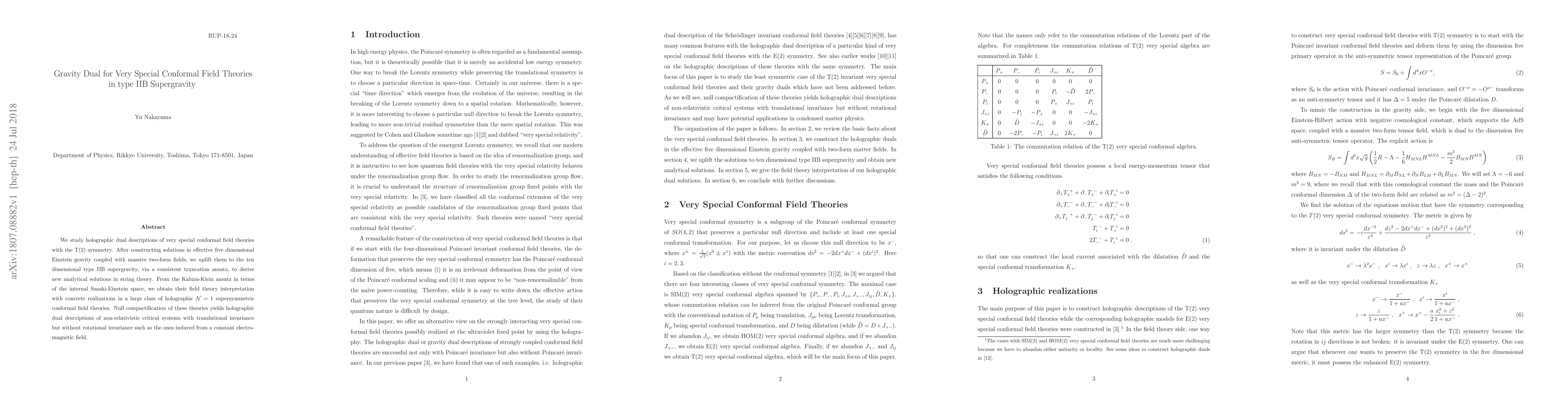 We study holographic dual descriptions of very special conformal field theories with the T(2) symmetry. After constructing solutions in effective five dimensional Einstein gravity coupled with massive two-form fields, we uplift them to the ten dimensional type IIB supergravity, via a consistent truncation ansatz, to derive new analytical solutions in string theory. From the Kaluza-Klein ansatz in terms of the internal Sasaki-Einstein space, we obtain their field theory interpretation with concrete realizations in a large class of holographic $\mathcal{N}=1$ supersymmetric conformal field theories. Null compactification of these theories yields holographic dual descriptions of non-relativistic critical systems with translational invariance but without rotational invariance such as the ones induced from a constant electromagnetic field.