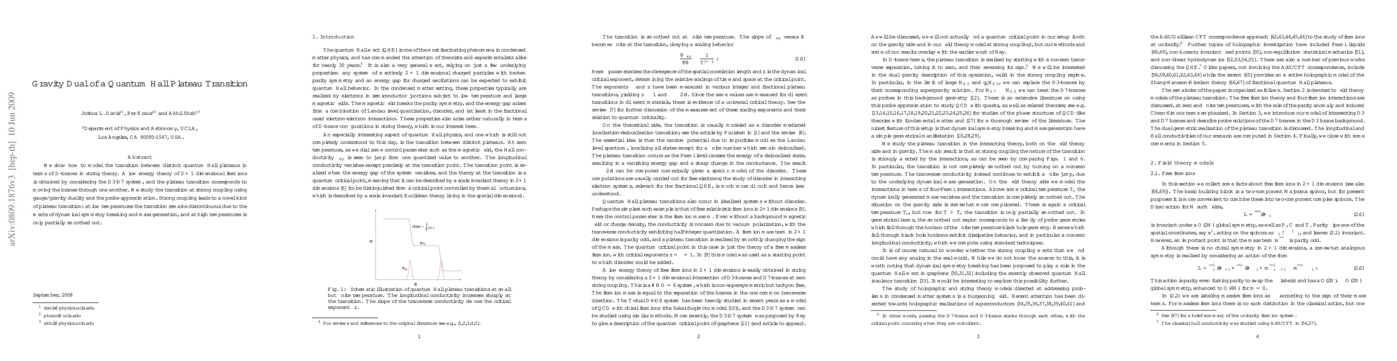 This paper models the quantum Hall plateau transition using D-branes in string theory, specifically through the D3-D7 system, and employs gauge/gravity duality to study the transition at strong coupling, revealing a unique discontinuous transition at low temperatures and partial smoothing at high temperatures.