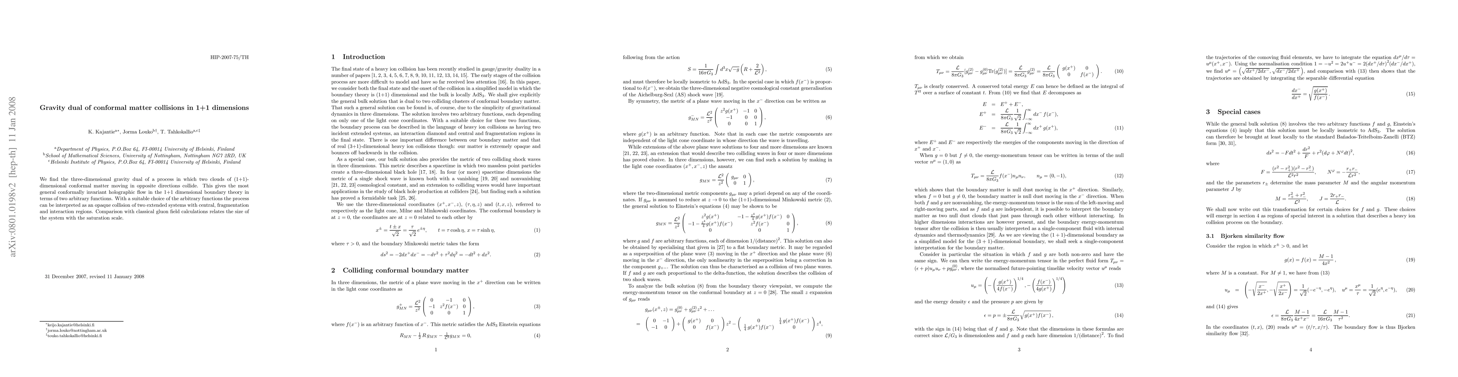 We find the three-dimensional gravity dual of a process in which two clouds of (1+1)-dimensional conformal matter moving in opposite directions collide. This gives the most general conformally invariant holographic flow in the 1+1 dimensional boundary theory in terms of two arbitrary functions. With a suitable choice of the arbitrary functions the process can be interpreted as an opaque collision of two extended systems with central, fragmentation and interaction regions. Comparison with classical gluon field calculations relates the size of the system with the saturation scale.