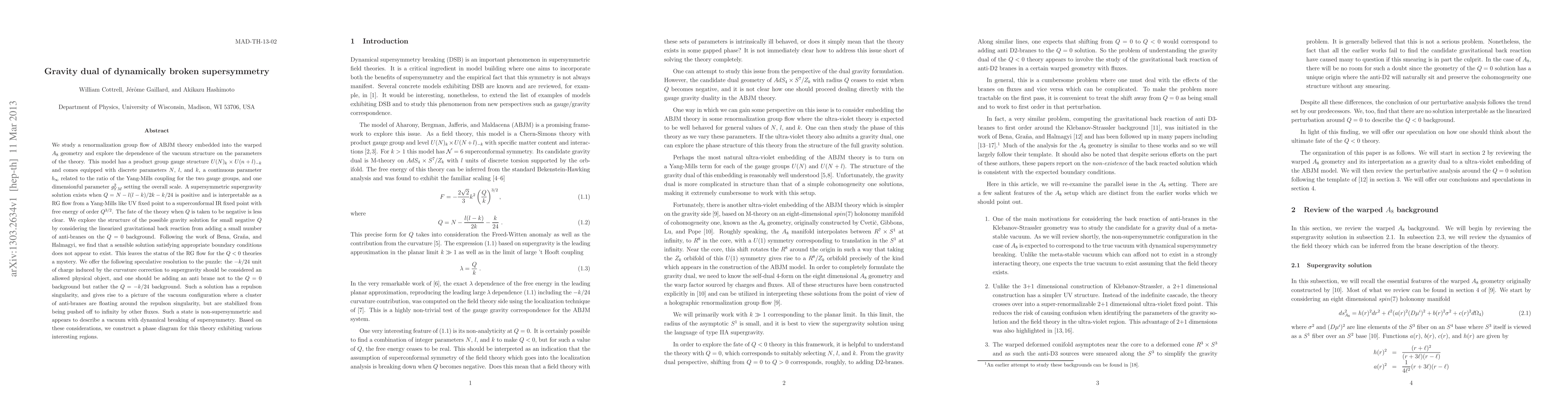 We study a renormalization group flow of ABJM theory embedded into the warped A_8 geometry and explore the dependence of the vacuum structure on the parameters of the theory. This model has a product group gauge structure U(N)xU(n+l) and comes equipped with discrete parameters N, l and k, a continuous parameter b related to the ratio of the Yang-Mills coupling for the two gauge groups, and one dimensionful parameter gYM^2 setting the overall scale. A supersymmetric supergravity solution exists when Q=N-l(l-k)/2k-k/24 is positive and is interpretable as a RG flow from a Yang-Mills like UV fixed point to a superconformal IR fixed point with free energy of order Q^3/2. The fate of the theory when Q is taken to be negative is less clear. We explore the structure of the possible gravity solution for small negative Q by considering the linearized gravitational back reaction from adding a small number of anti-branes on the Q=0 background. Following the work of Bena, et.al., we find that a sensible solution satisfying appropriate boundary conditions does not appear to exist. This leaves the status of the RG flow for the Q<0 theories a mystery. We offer the following speculative resolution to the puzzle: the -k/24 unit of charge induced by the curvature correction to supergravity should be considered an allowed physical object, and one should be adding an anti brane not to the Q=0 background but rather the Q=-k/24 background. Such a solution has a repulson singularity, and gives rise to a picture of the vacuum configuration where a cluster of anti-branes are floating around the repulson singularity, but are stabilized from being pushed off to infinity by other fluxes. Such a state is non-supersymmetric and appears to describe a vacuum with dynamical breaking of supersymmetry. Based on these considerations, we construct a phase diagram for this theory exhibiting various interesting regions.
