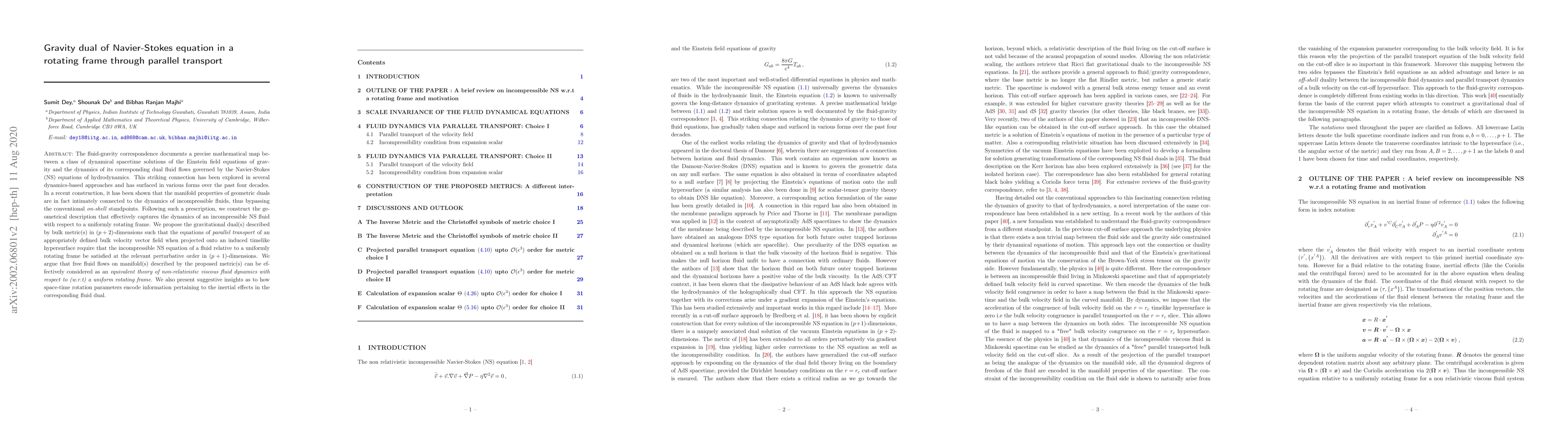 The fluid-gravity correspondence documents a precise mathematical map between a class of dynamical spacetime solutions of the Einstein field equations of gravity and the dynamics of its corresponding dual fluid flows governed by the Navier-Stokes (NS) equations of hydrodynamics. This striking connection has been explored in several dynamics-based approaches and has surfaced in various forms over the past four decades. In a recent construction, it has been shown that the manifold properties of geometric duals are in fact intimately connected to the dynamics of incompressible fluids, thus bypassing the conventional on-shell standpoints. Following such a prescription, we construct the geometrical description that effectively captures the dynamics of an incompressible NS fluid with respect to a uniformly rotating frame. We propose the gravitational dual(s) described by bulk metric(s) in $(p+2)$-dimensions such that the equations of parallel transport of an appropriately defined bulk velocity vector field when projected onto an induced timelike hypersurface require that the incompressible NS equation of a fluid relative to a uniformly rotating frame be satisfied at the relevant perturbative order in $(p+1)$-dimensions. We argue that free fluid flows on manifold(s) described by the proposed metric(s) can be effectively considered as an equivalent theory of non-relativistic viscous fluid dynamics with respect to (w.r.t) a uniform rotating frame. We also present suggestive insights as to how space-time rotation parameters encode information pertaining to the inertial effects in the corresponding fluid dual.