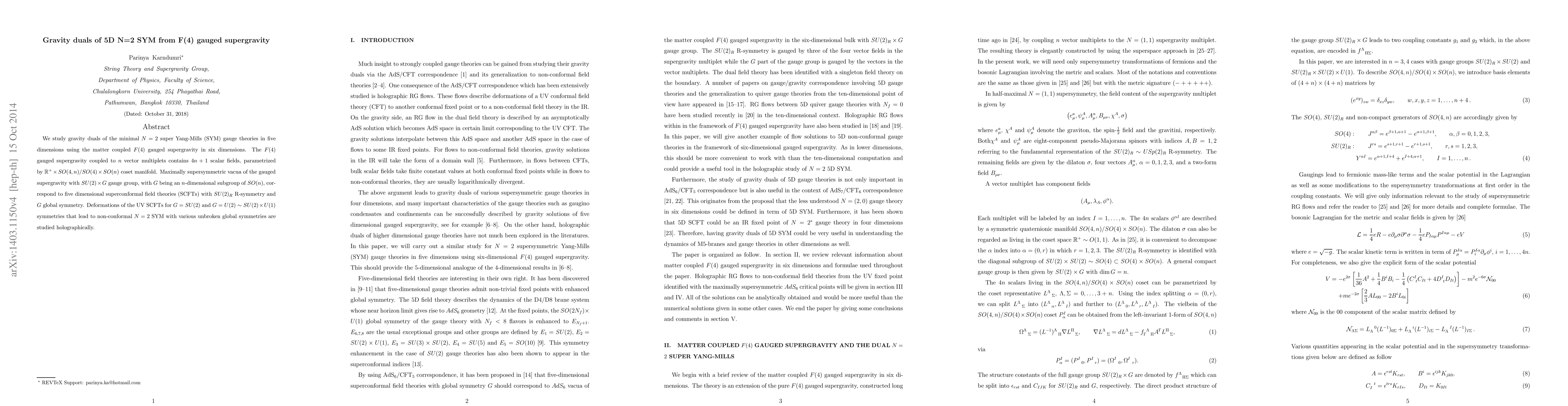 This paper explores the holographic duals of five-dimensional $N=2$ super Yang-Mills theories through matter-coupled $F(4)$ gauged supergravity in six dimensions. It investigates how deformations of these dual SCFTs lead to non-conformal $N=2$ SYM theories with various unbroken symmetries.