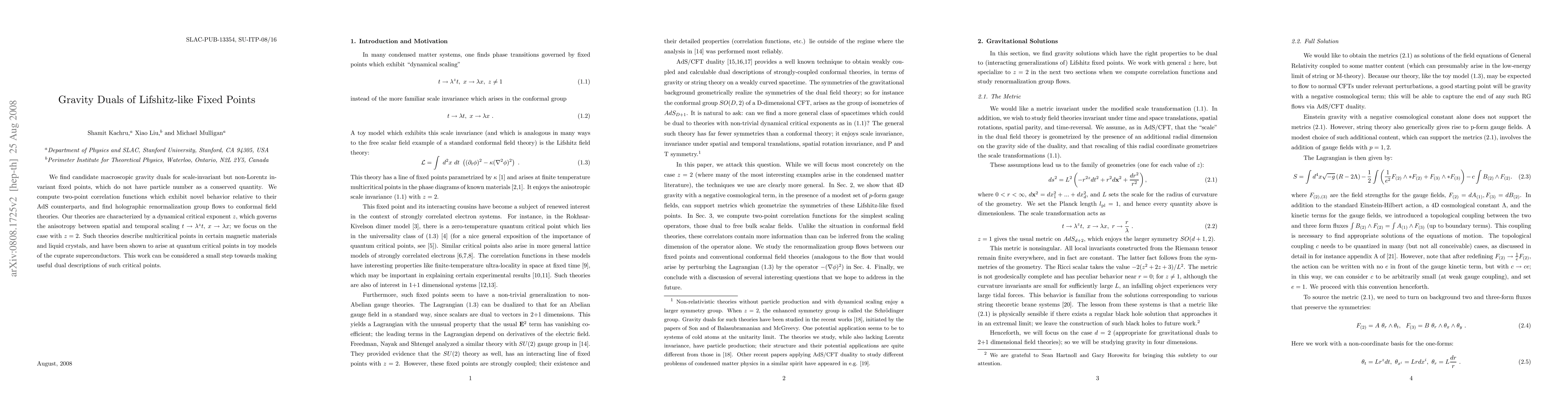 We find candidate macroscopic gravity duals for scale-invariant but non-Lorentz invariant fixed points, which do not have particle number as a conserved quantity. We compute two-point correlation functions which exhibit novel behavior relative to their AdS counterparts, and find holographic renormalization group flows to conformal field theories. Our theories are characterized by a dynamical critical exponent $z$, which governs the anisotropy between spatial and temporal scaling $t \to \lambda^z t$, $x \to \lambda x$; we focus on the case with $z=2$. Such theories describe multicritical points in certain magnetic materials and liquid crystals, and have been shown to arise at quantum critical points in toy models of the cuprate superconductors. This work can be considered a small step towards making useful dual descriptions of such critical points.