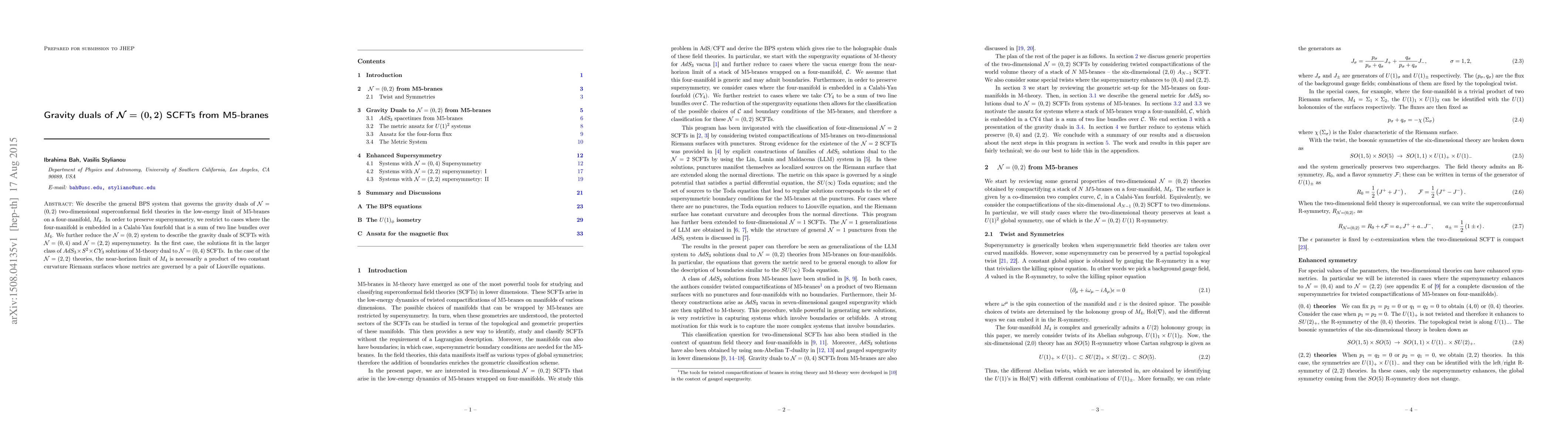 This paper outlines the supersymmetric system governing the gravity duals of N=(0,2) superconformal field theories derived from M5-branes on a four-manifold. It focuses on Calabi-Yau fourfolds embedded in line bundles, and extends to duals for N=(0,4) and N=(2,2) SCFTs, characterized by AdS3xS2xCY3 solutions and Liouville equations, respectively.
