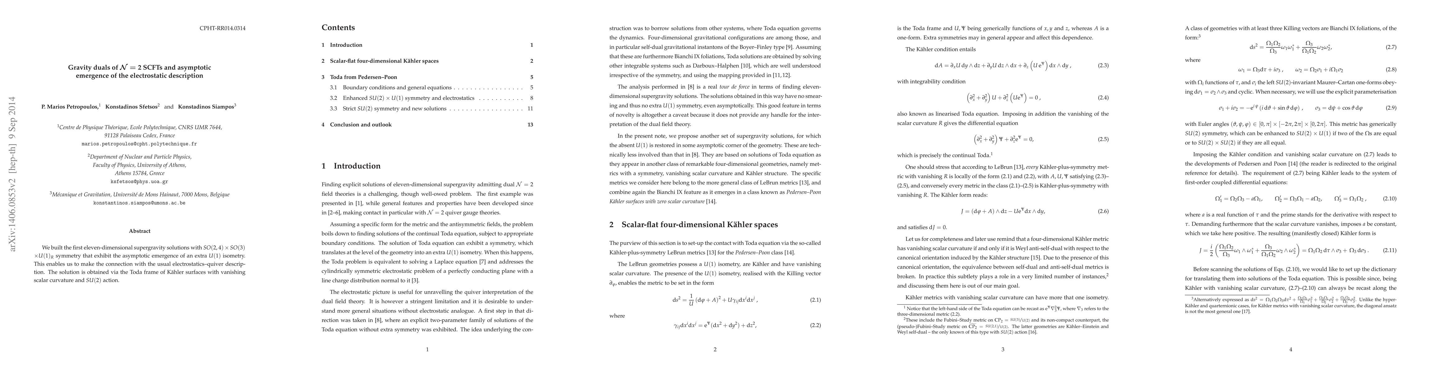 We built the first eleven-dimensional supergravity solutions with SO(2,4)xSO(3)xU(1)_R symmetry that exhibit the asymptotic emergence of an extra U(1) isometry. This enables us to make the connection with the usual electrostatics-quiver description. The solution is obtained via the Toda frame of Kahler surfaces with vanishing scalar curvature and SU(2) action.