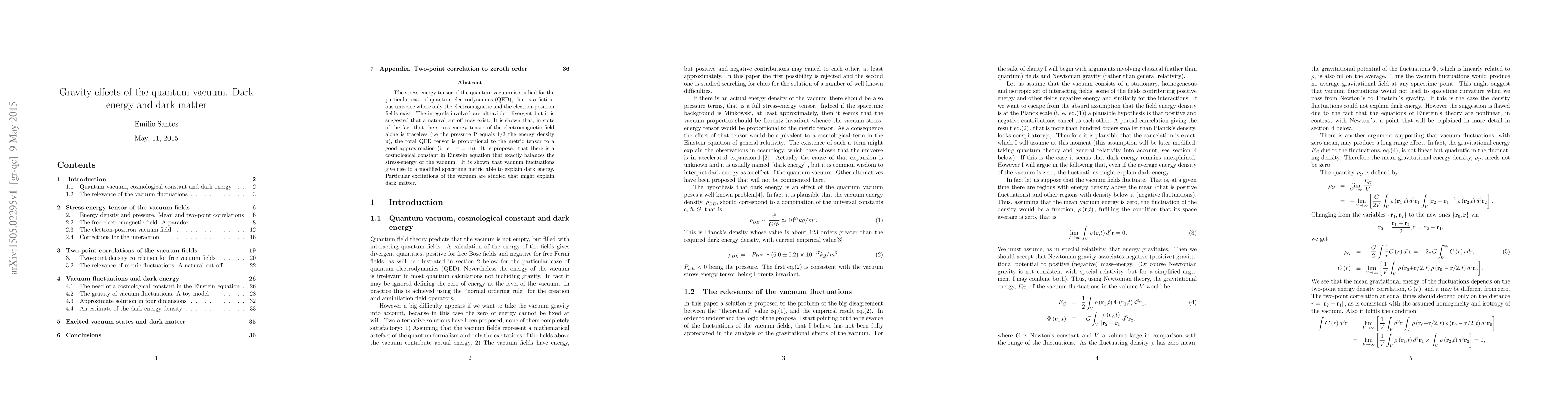 The stress-energy tensor of the quantum vacuum is studied for the particular case of quantum electrodynamics (QED), that is a fictituous universe where only the electromagnetic and the electron-positron fields exist. The integrals involved are ultraviolet divergent but it is suggested that a natural cut-off may exist. It is shown that, in spite of the fact that the stress-energy tensor of the electromagnetic field alone is traceless (i.e the pressure P equals 1/3 the energy density u), the total QED tensor is proportional to the metric tensor to a good approximation (i. e. P = -u). It is proposed that there is a cosmological constant in Einstein equation that exactly balances the stress-energy of the vacuum. It is shown that vacuum fluctuations give rise to a modified spacetime metric able to explain dark energy. Particular excitations of the vacuum are studied that might explain dark matter.