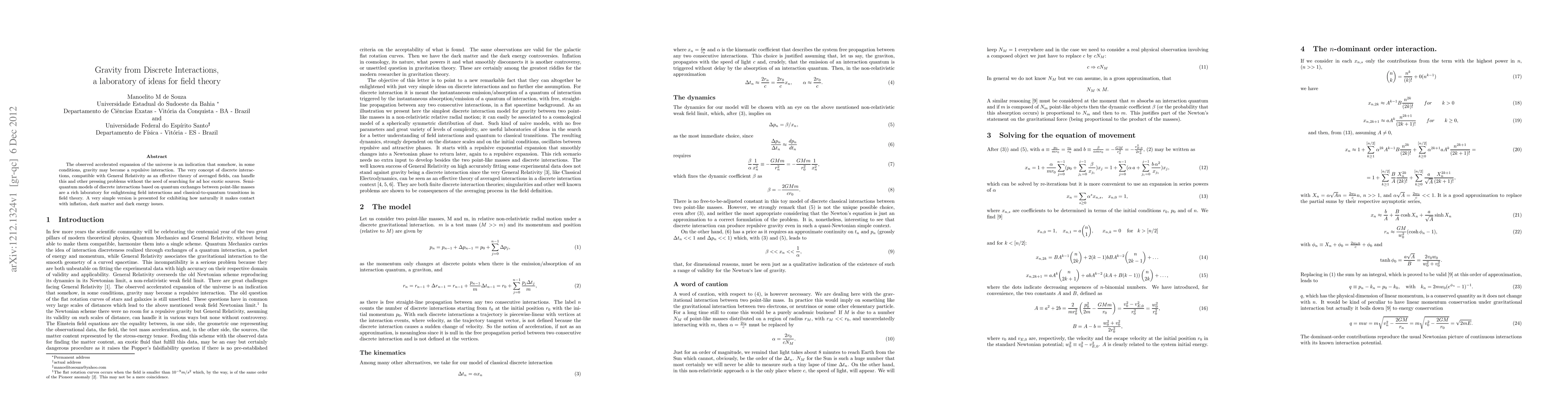 The observed accelerated expansion of the universe is an indication that somehow, in some conditions, gravity may become a repulsive interaction. The very concept of discrete interactions, compatible with General Relativity as an effective theory of averaged fields, can handle this and other pressing problems without the need of searching for ad hoc exotic sources. Semi-quantum models of discrete interactions based on quantum exchanges between point-like masses are a rich laboratory for enlightening field interactions and classical-to-quantum transitions in field theory. A very simple version is presented for exhibiting how naturally it makes contact with inflation, dark matter and dark energy issues.