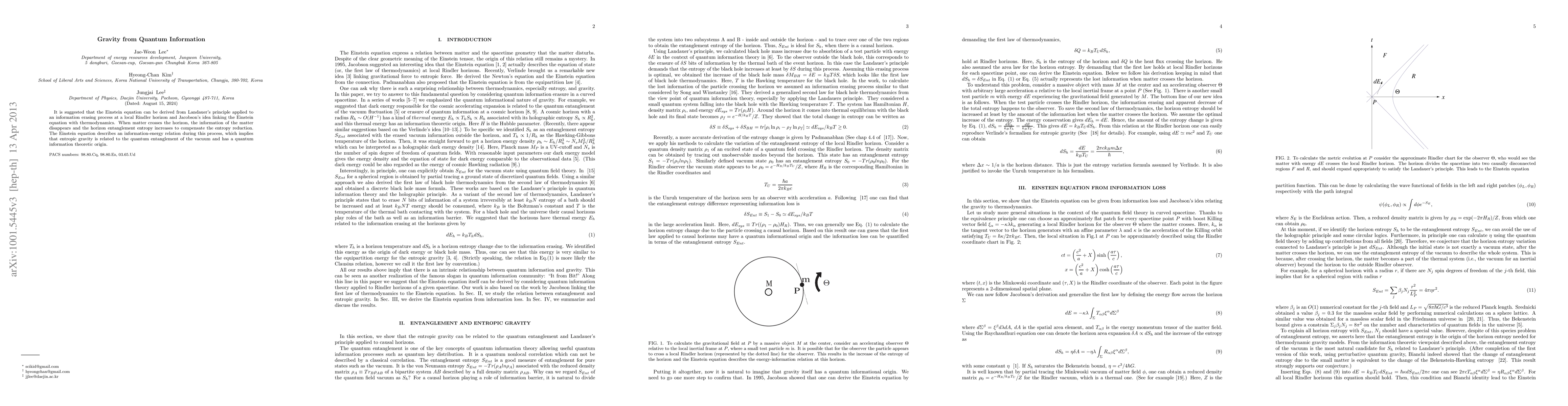 It is suggested that the Einstein equation can be derived from Landauer's principle applied to an information erasing process at a local Rindler horizon and Jacobson's idea linking the Einstein equation with thermodynamics. When matter crosses the horizon, the information of the matter disappears and the horizon entanglement entropy increases to compensate the entropy reduction. The Einstein equation describes an information-energy relation during this process, which implies that entropic gravity is related to the quantum entanglement of the vacuum and has a quantum information theoretic origin.