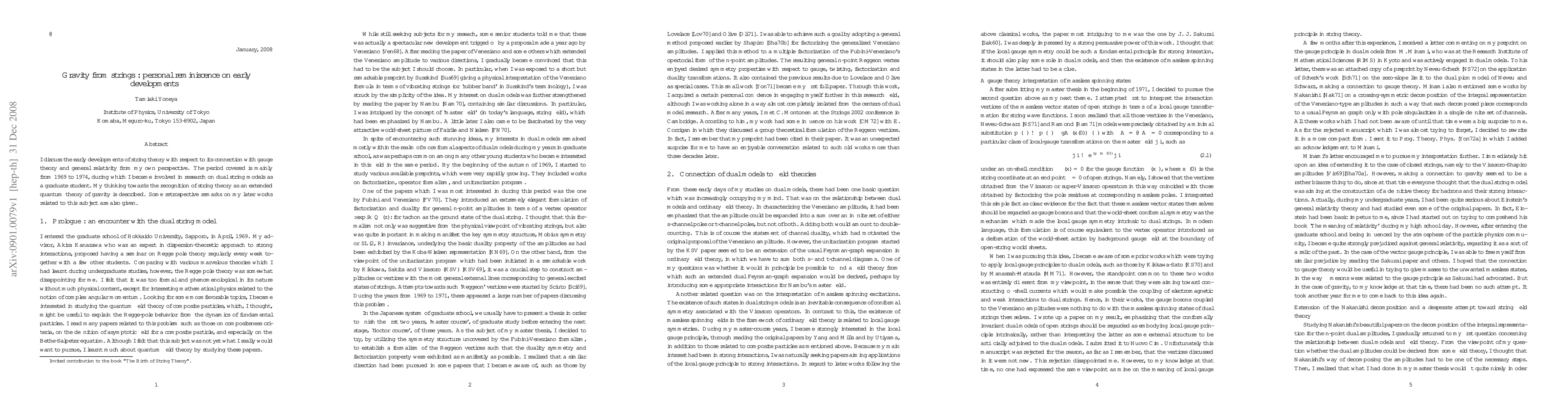 I discuss the early developments of string theory with respect to its connection with gauge theory and general relativity from my own perspective. The period covered is mainly from 1969 to 1974, during which I became involved in research on dual string models as a graduate student. My thinking towards the recognition of string theory as an extended quantum theory of gravity is described. Some retrospective remarks on my later works related to this subject are also given.