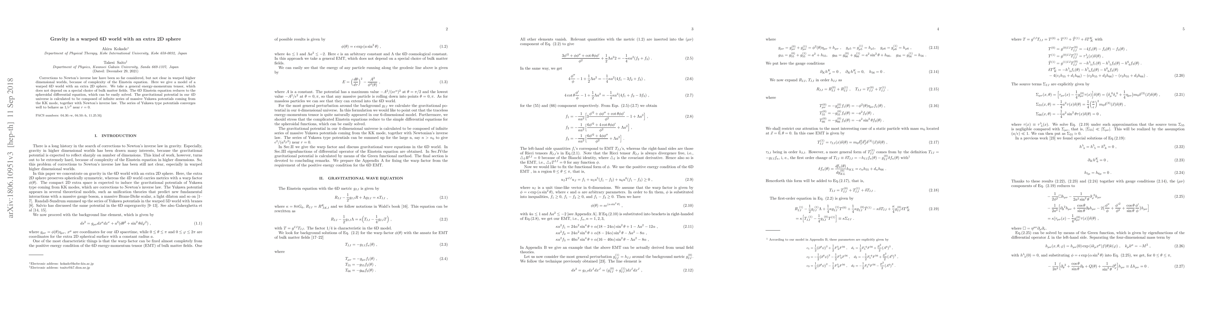 This paper proposes a model of a warped 6D spacetime with an extra 2D sphere, solving the 6D Einstein equation to derive a gravitational potential in 4D. The potential is shown to consist of an infinite series of Yukawa potentials from Kaluza-Klein modes, converging to behave as $1/r^3$ near $r=0$.