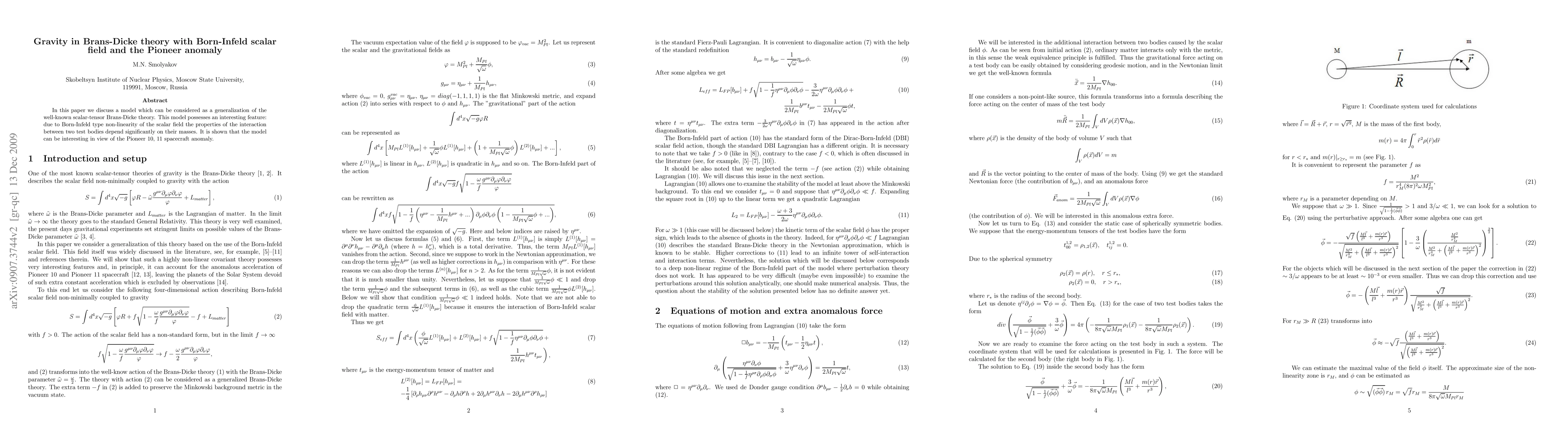 In this paper we discuss a model which can be considered as a generalization of the well-known scalar-tensor Brans-Dicke theory. This model possesses an interesting feature: due to Born-Infeld type non-linearity of the scalar field the properties of the interaction between two test bodies depend significantly on their masses. It is shown that the model can be interesting in view of the Pioneer 10, 11 spacecraft anomaly.