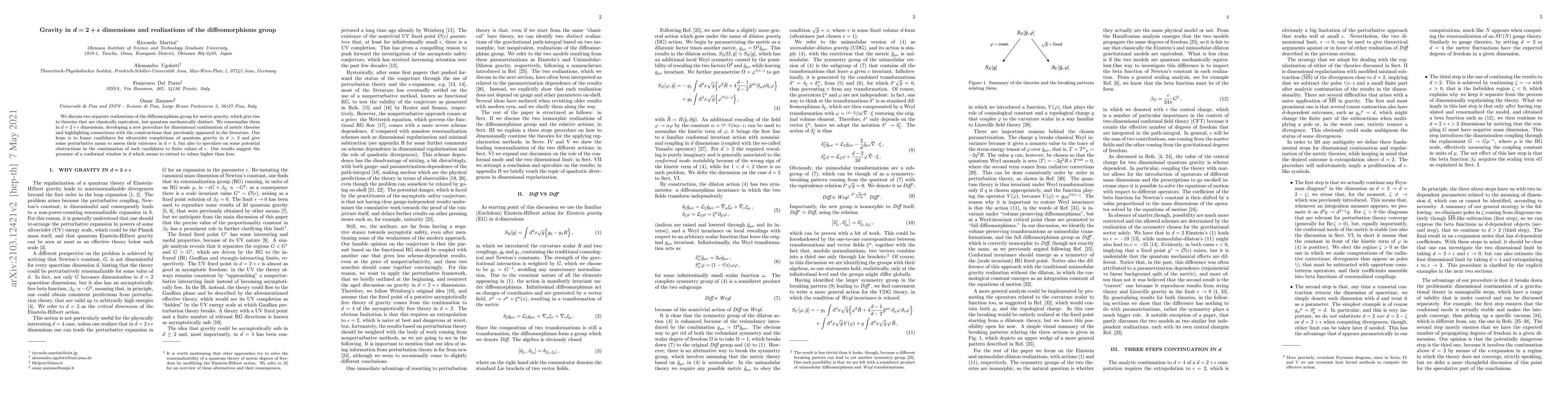 We discuss two distinct realizations of the diffeomorphism group for metric gravity, which give rise to theories that are classically equivalent, but quantum mechanically distinct. We renormalize them in $d=2+\epsilon$ dimensions, developing a new procedure for dimensional continuation of metric theories and highlighting connections with the constructions that previously appeared in the literature. Our hope is to frame candidates ultraviolet completions of quantum gravity in $d>2$ and give some perturbative mean to assess its existence in $d=4$, but also to speculate on some potential obstructions in the continuation of such candidates to finite values of $\epsilon$. Our results suggest the presence of a conformal window in $d$ which seems to extend to values higher than four.