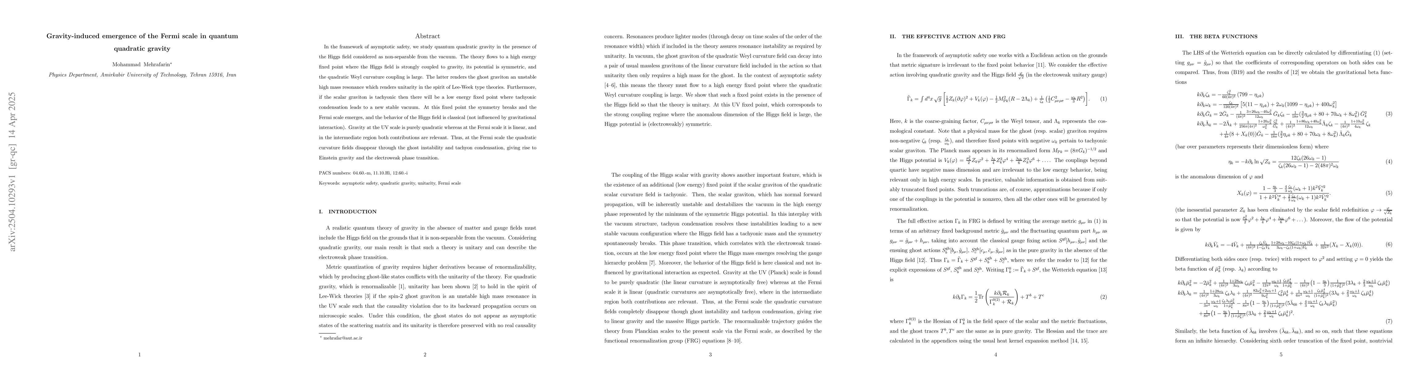 The paper presents a detailed analysis of quantum quadratic gravity with the Higgs field, utilizing the FRG approach to uncover fixed points and their implications for the emergence of the Fermi scale and electroweak symmetry breaking.