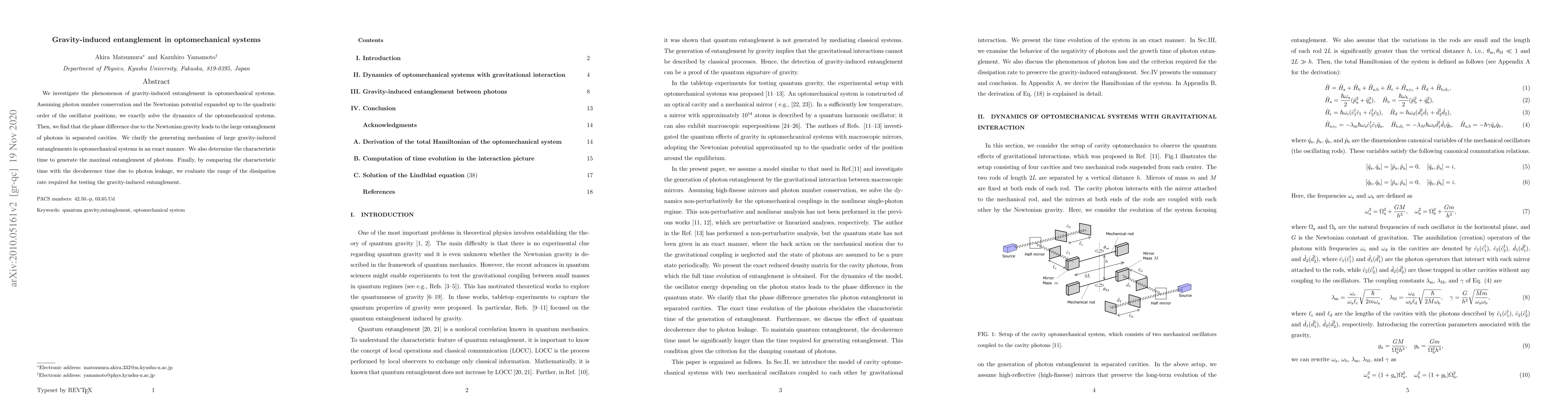 We investigate the phenomenon of gravity-induced entanglement in optomechanical systems. Assuming photon number conservation and the Newtonian potential expanded up to the quadratic order of the oscillator positions, we exactly solve the dynamics of the optomehcanical systems. Then, we find that the phase difference due to the Newtonian gravity leads to the large entanglement of photons in separated cavities. We clarify the generating mechanism of large gravity-induced entanglements in optomechanical systems in an exact manner. We also determine the characteristic time to generate the maximal entanglement of photons. Finally, by comparing the characteristic time with the decoherence time due to photon leakage, we evaluate the range of the dissipation rate required for testing the gravity-induced entanglement.