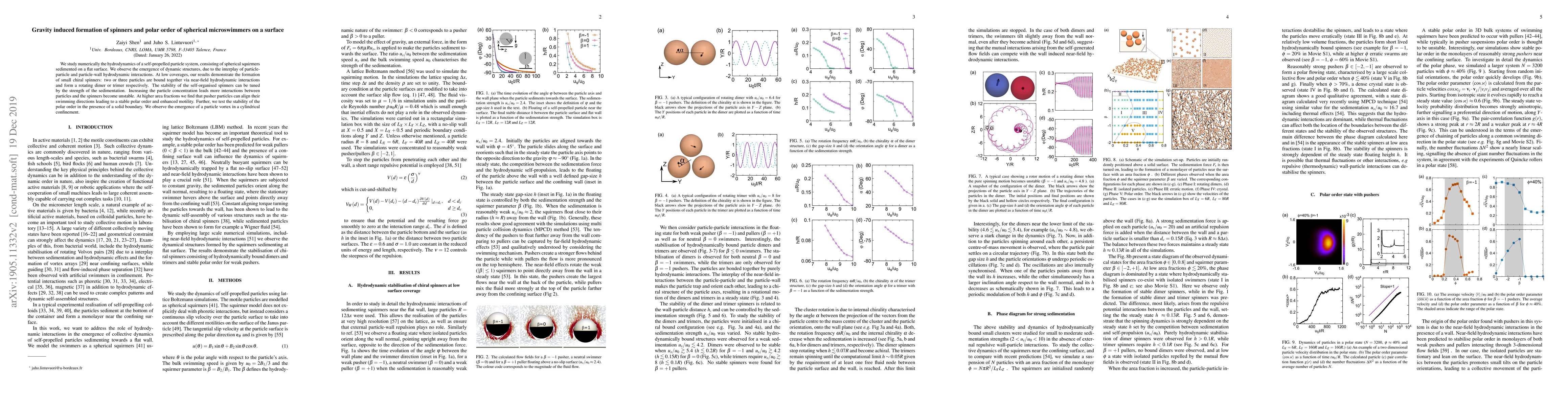 We study numerically the hydrodynamics of a self-propelled particle system, consisting of spherical squirmers sedimented on a flat surface. We observe the emergence of dynamic structures, due to the interplay of particle-particle and particle-wall hydrodynamic interactions. At low coverages, our results demonstrate the formation of small chiral spinners: two or three particles are bound together via near-field hydrodynamic interactions and form a rotating dimer or trimer respectively. The stability of the self-organised spinners can be tuned by the strength of the sedimentation. Increasing the particle concentration leads more interactions between particles and the spinners become unstable. At higher area fractions we find that pusher particles can align their swimming directions leading to a stable polar order and enhanced motility. Further, we test the stability of the polar order in the presence of a solid boundary. We observe the emergence of a particle vortex in a cylindrical confinement.