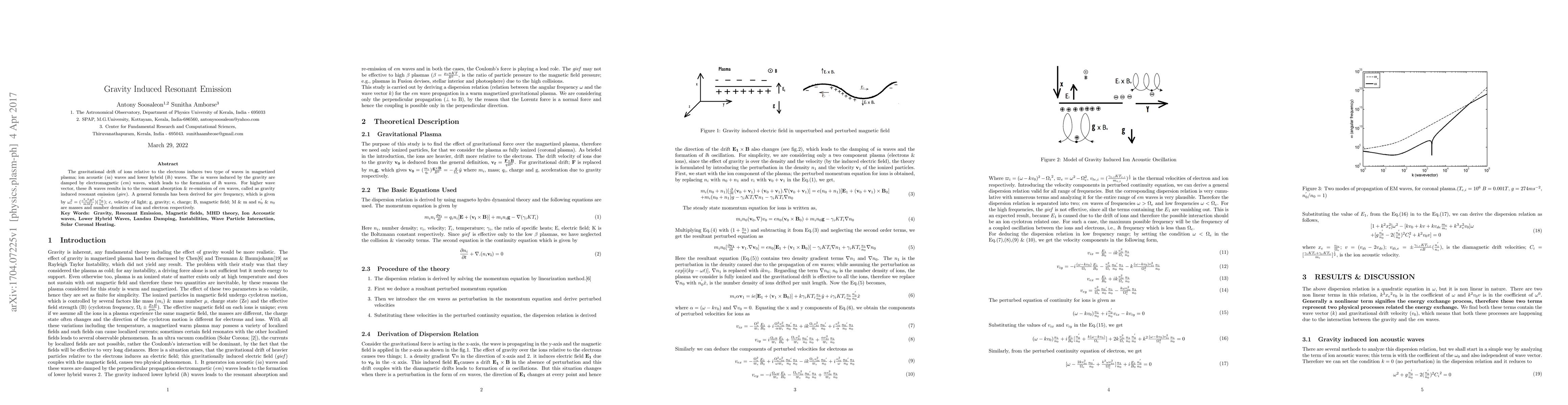This paper investigates the phenomenon of gravity induced resonant emission (gire) in magnetized plasma, where gravitational drift of ions generates ion acoustic and lower hybrid waves. The study derives a general formula for gire frequency, highlighting its dependence on fundamental plasma properties.